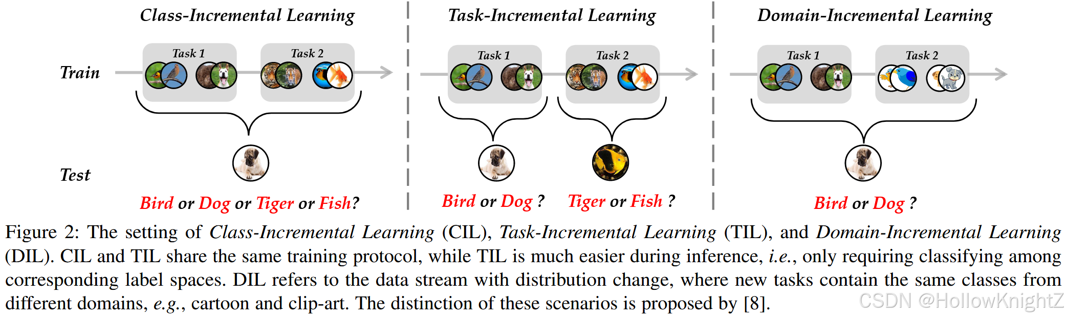 由于数据流量是不断的,并且要求训练一个终身的时间,增量学习也被成为"持续学习"或"终身学习"。除了类别增量学习,还有其他细粒度的设置来解决增量学习问题,例如任务增量学习(TIL)和域增量学习(DIL),图2展示了这三种方式。