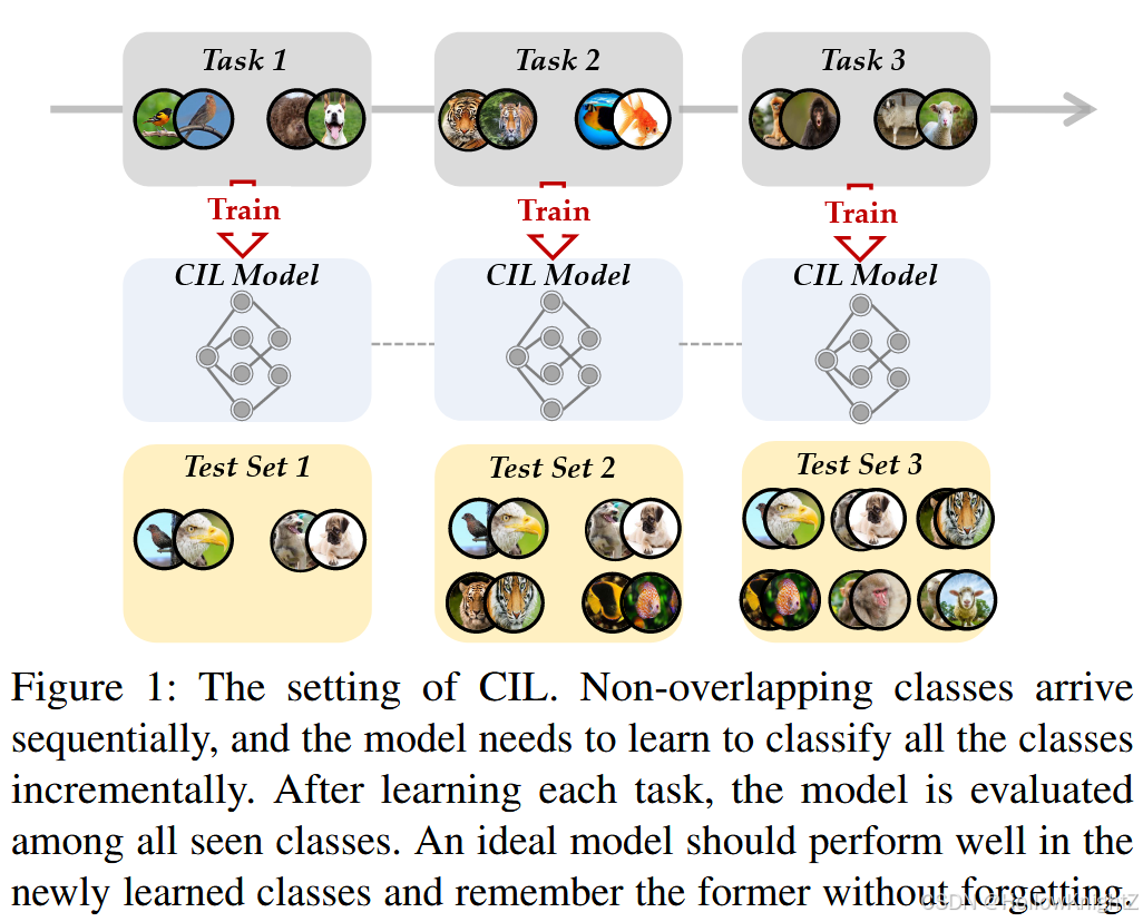 图1描述了CIL的典型设置。训练数据以流的形式出现,在每个时间戳中,可以得到一个新的训练数据集(图中记为"任务"),并且需要用新的类别来更新模型。例如,模型在第一个任务中学习"鸟"和"狗",在第二个任务中学习"老虎"和"鱼",在第三个任务中学习"猴子"和"羊"等。随后,该模型在所有可见的类中进行测试,以评估其是否对他们具有区分性。一个好的模型应该在刻画新类的特征和保留先前学习过的旧类的模式之间取得平衡。这种权衡也被成为神经系统中"稳定性-可塑性两难问题",其中稳定性表示保持原有知识的能力,可塑性表示适应新模式的能力。