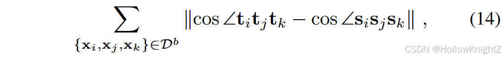 为了进行关系蒸馏,需要提取一组实例,例如三元组。我们将抽取到的三元组记为 { x i , x j , x k } \{ x_i,x_j,x_k \} {xi,xj,xk},其中 x i x_i xi 称为锚点。在一个三元组中,目标邻居 x j x_j xj 与锚点 x i x_i xi 具有相同的类,而冒名者 x k x_k xk 与 x i x_i xi (通常来自不同的类)不相似。R-DFCIL 建议对三元组之间的夹角进行映射: