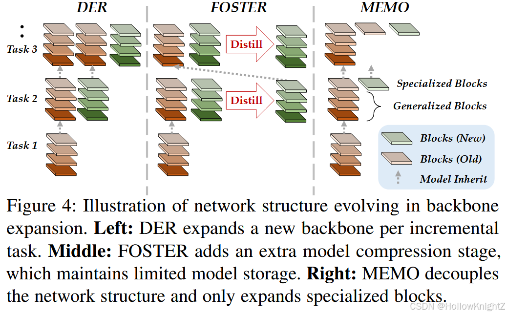 其中 ϕ ‾ o l d ( x ) \overline{\phi}{old}(x) ϕold(x) 表示被冻结的骨干。DER还采用了一个辅助损失来区分旧类和新类。式( 9 )描绘了一种用新的特征不断扩展模型的方法。在这种情况下,如果用"汽车"来优化旧的骨架,那么 ϕ o l d \phi{old} ϕold 提取的特征就代表了车轮和车窗。用"猫"训练的新骨干负责提取胡须和条纹。由于旧的主干在后期被冻结,学习新类不会覆盖旧类的特征,遗忘得到缓解。图4 (左)描述了DER的模型演化。