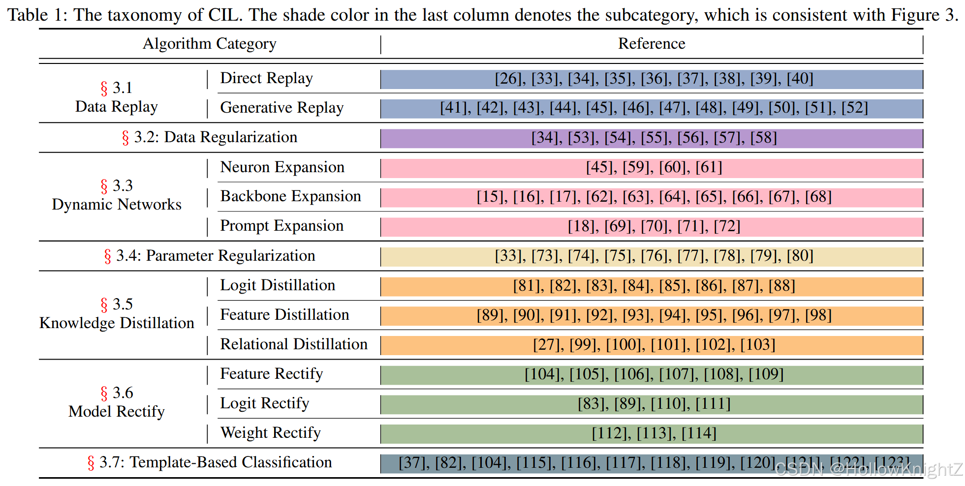 近年来,针对CIL的研究工作层出不穷,引起了机器学习和计算机视觉界的热烈讨论。本文从7个方面对这些方法进行了分类学整理,如表1所示。