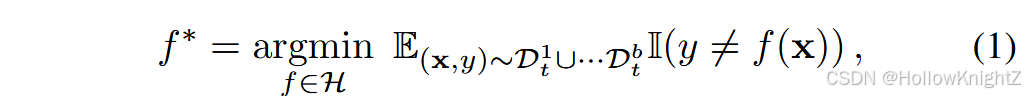 其中 H H H 是假设空间, I ( ⋅ ) I(·) I(⋅) 是指示函数,如果表达式成立,则输出1,否则输出0。 D t b D_t^b Dtb 表示任务 b b b 的任务分布。一个好的CIL模型满足式(1)在所有类中具有可区分性,他不仅对新类有效,而且保留了旧类的知识。