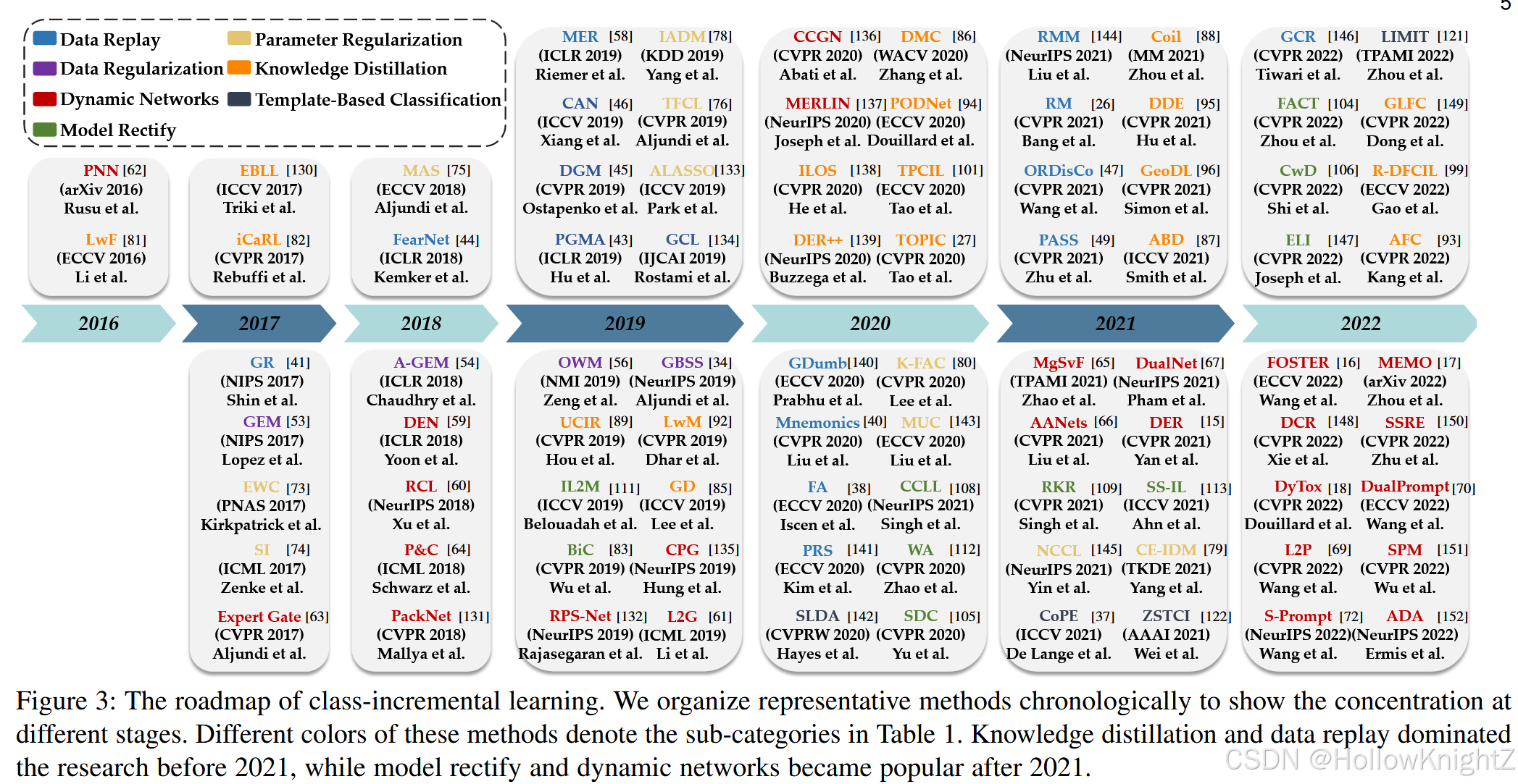具体来说,数据重放和数据规则化集中于通过示例求解CIL,或者通过重访以前的实例,或者使用它们作为指标来规则化模型更新。动态网络扩展网络结构以获得更强的表征能力,而基于参数正则化的方法则对模型参数进行正则化,防止其漂移以抵抗遗忘。 此外,知识蒸馏构建增量模型之间的映射以抵抗遗忘,模型校正旨在减少增量学习器的有偏预测。基于模板的分类旨在将推理转化为查询与模板的匹配。图3中按时间顺序列出代表性方法,以展示不同时期的研究重点。