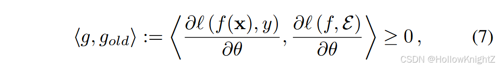 其中 f b − 1 f^{b-1} fb−1 表示训练完最后一个任务 D b − 1 D^{b-1} Db−1 后的增量模型。式6对模型进行了有约束的优化,要求用样例集计算的损失不要超过原模型。由于范例是来自以前类的具有代表性的实例,GEM在学习新类和保留原有知识之间取得了平衡。此外,他还变换了式6中的约束为: