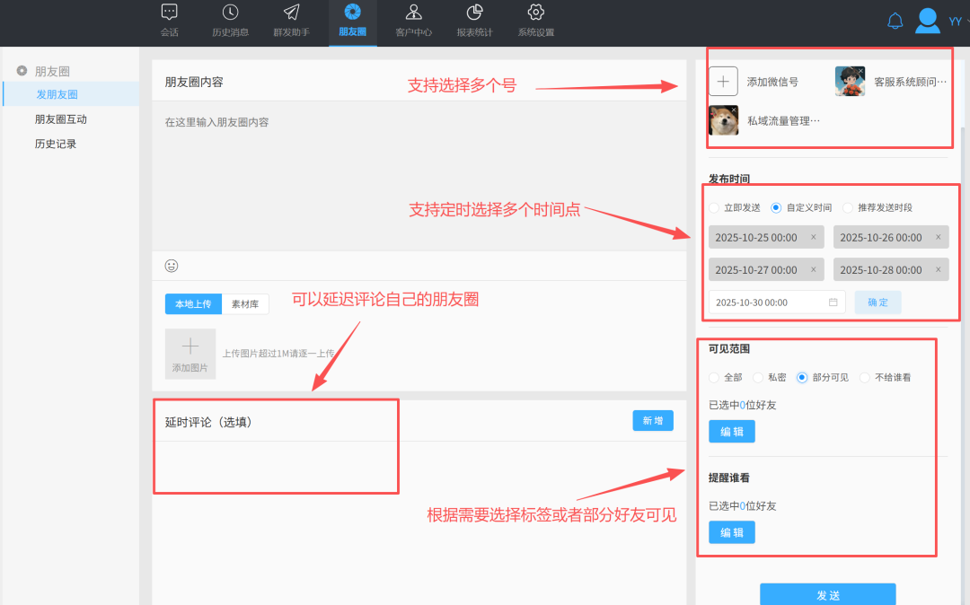 朋友圈定时管理:支持多个账号朋友圈的立即或定时发送,可一键转发、智能跟圈,无需手动复制保存,大幅提升运营效率。
