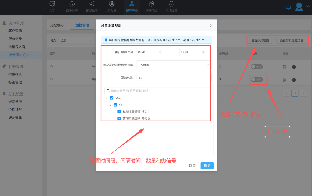 批量自动加好友:导入联系方式后,可设置自动添加任务,系统将持续执行,助你高效拓展精准客户。