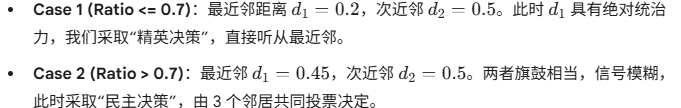 在预测时,我们不仅看谁是最近邻,还看它到底有多"近"。