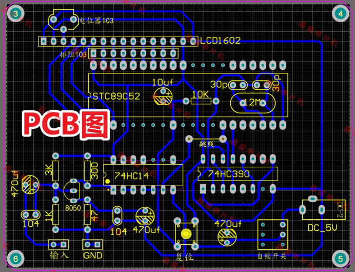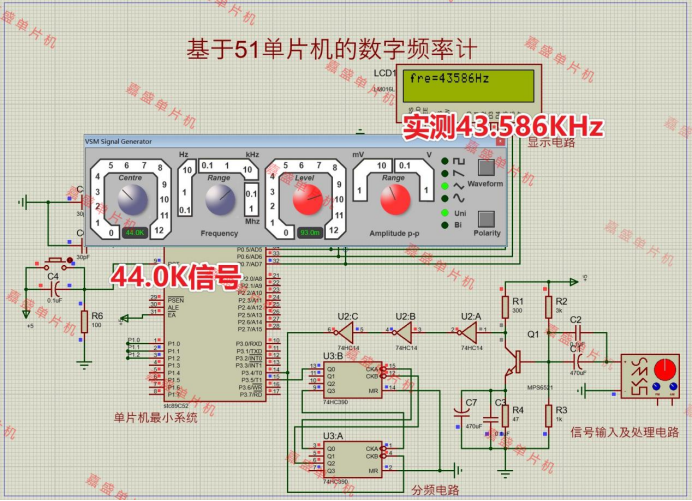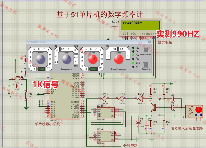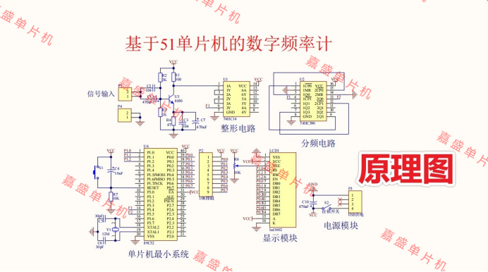 由51单片机+信号输入+74HC14整形电路+74HC390分频电路+LCD1602显示模块+电源构成。