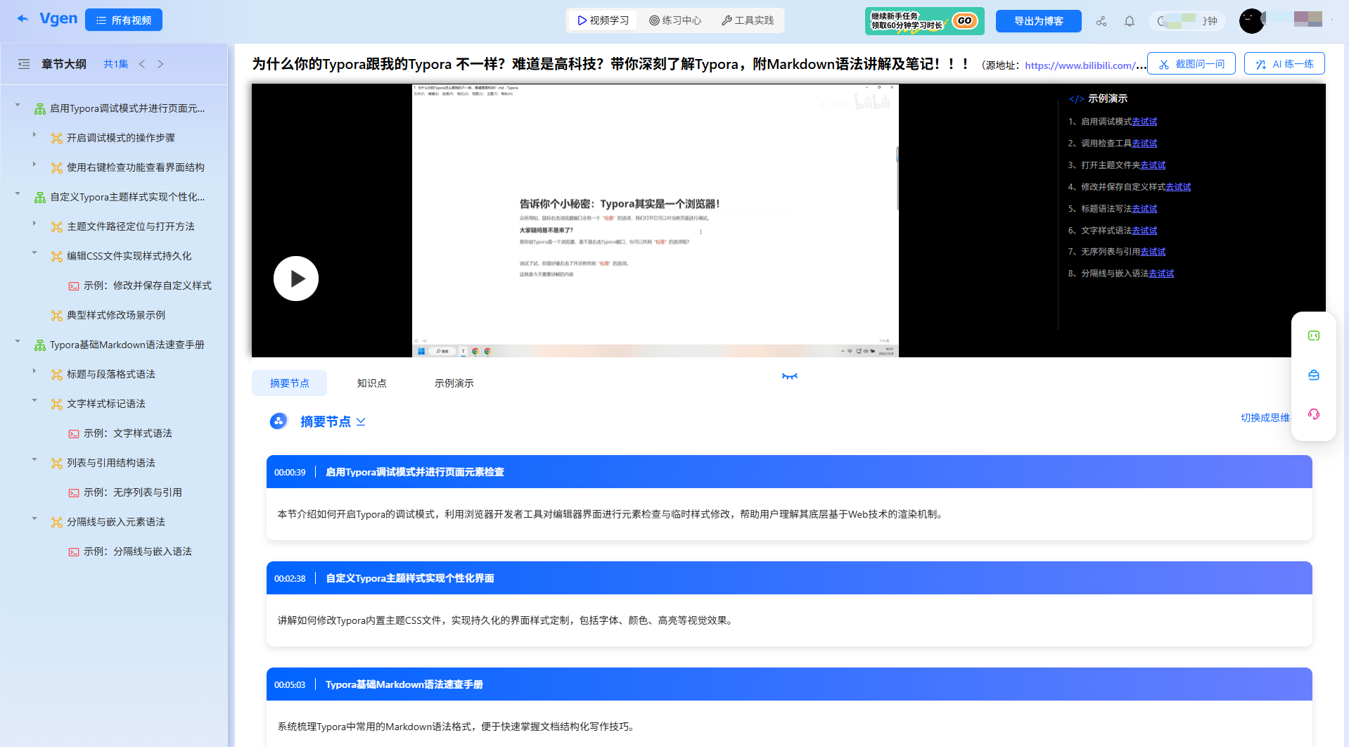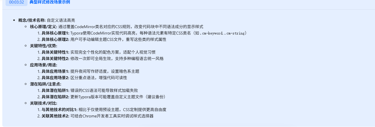 AI会过滤视频里的闲聊和重复操作,按"Markdown核心语法→Typora基础配置→高效功能→插件推荐"的逻辑,把40分钟视频浓缩成清晰的知识框架和思维导图,每个节点都标着视频时间戳,关键语法还会做"对比表",不用记零散笔记也能串起完整用法。
