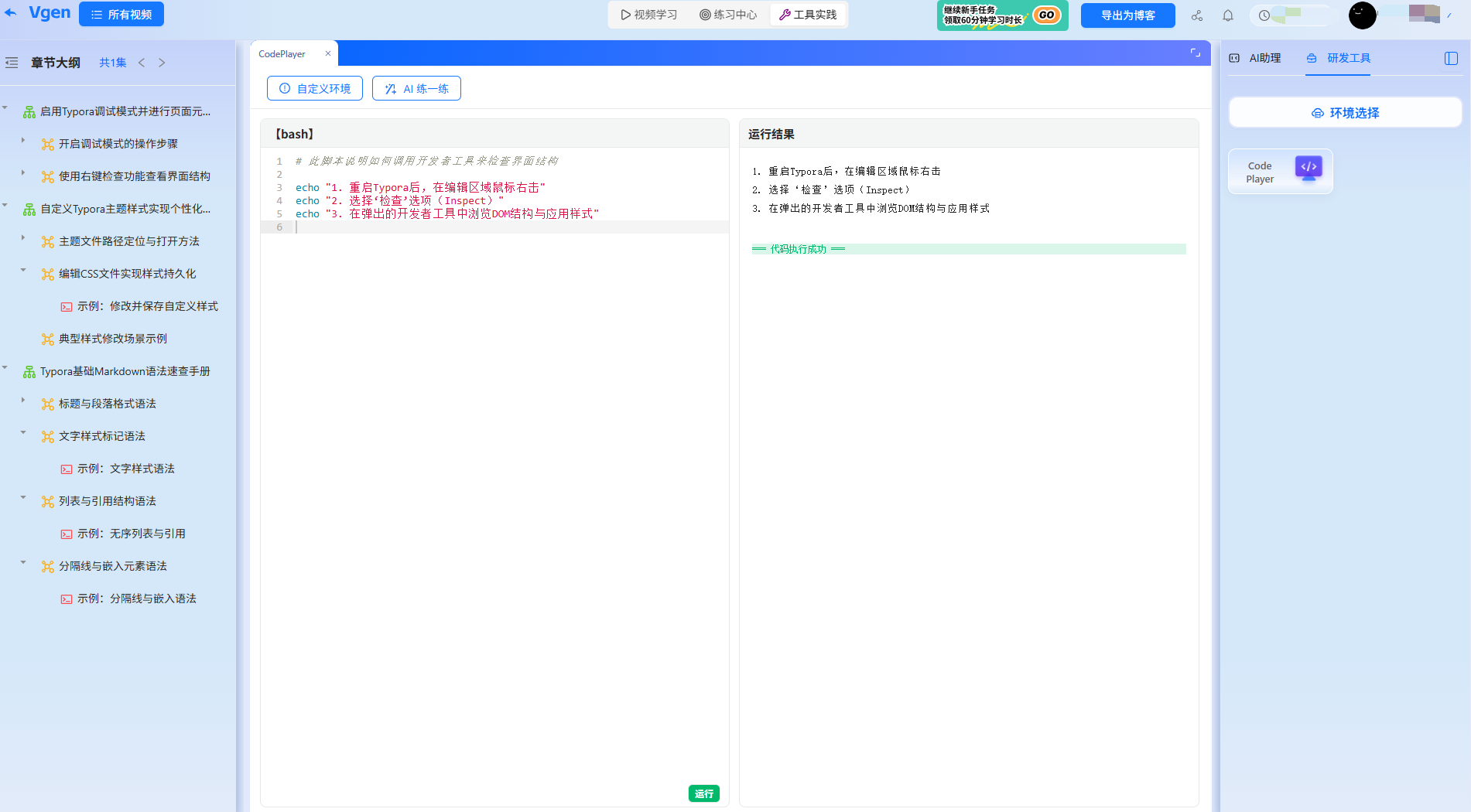 工具类学习的核心不是"看会多少操作",而是"记住关键规则、掌握配置逻辑、发掘高效用法"。通过"结构化框架理规则→在线编辑器练语法→智能出题补漏洞"的闭环,不仅掌握了视频里的所有内容,还能自定义CSS主题、批量处理笔记格式,把Typora用成了"程序员专属笔记神器",找对方法帮你拆解细节、减少试错成本,才能真正把工具用透。