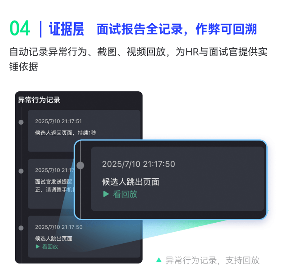 - AI实时提醒机制:发现异常时向面试官发送系统消息提示,供人工复核