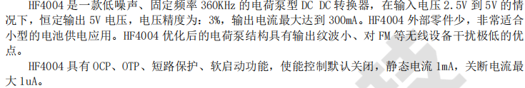 HF4004 是一款采用电荷泵架构的微型、低噪声、固定频率升压DC-DC转换器