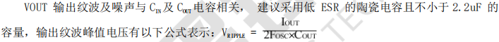 - 纹波电压估算公式 V_RIPPLE = IOUT / (2 × FOSC × COUT)