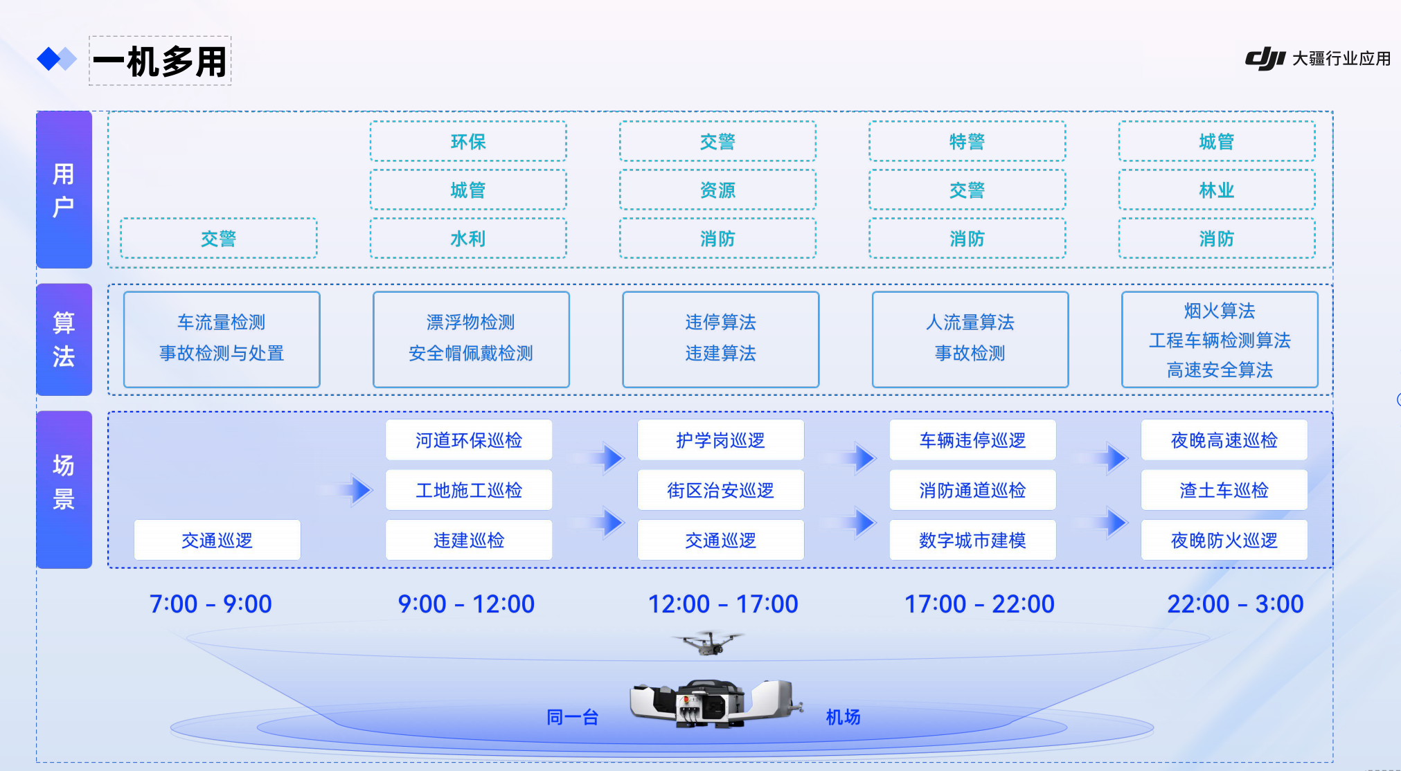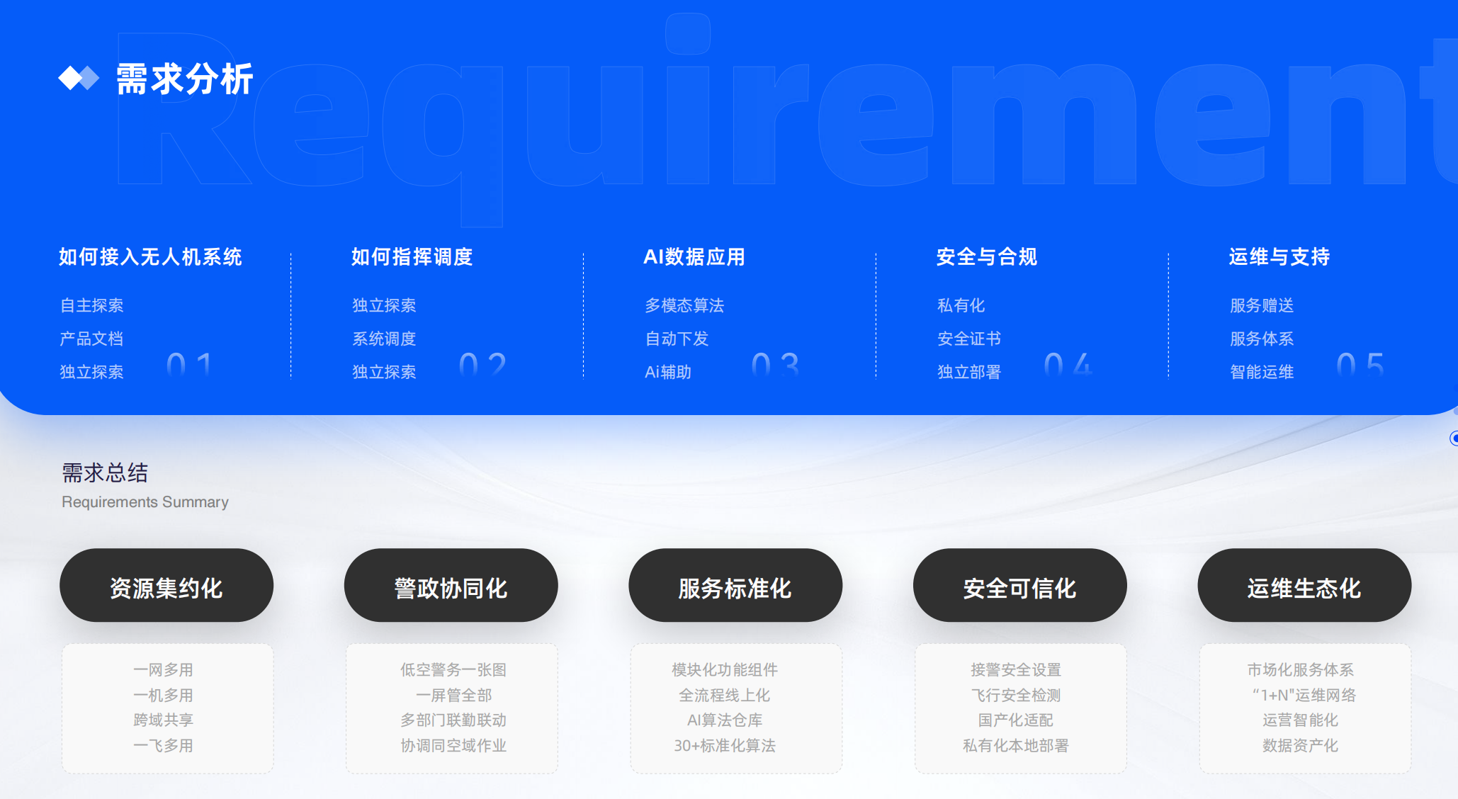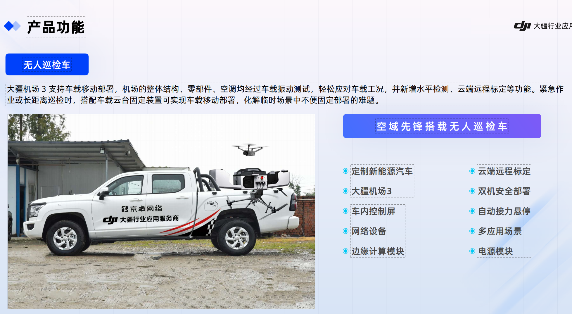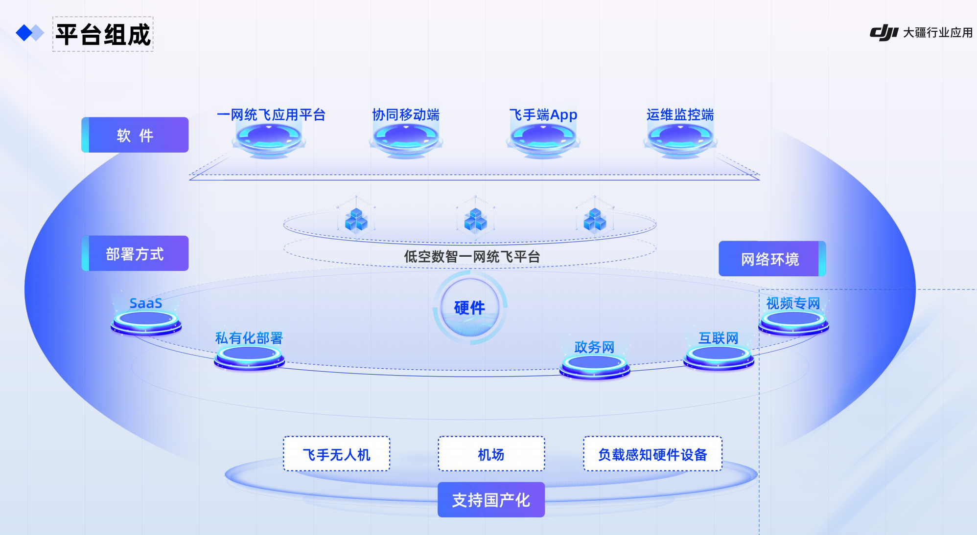 - 终端层:接入无人机、智能机场、负载设备(云台、喊话器等),支持大疆全系列机场及单兵无人机,兼容第三方硬件,实现设备统一接入与管控。