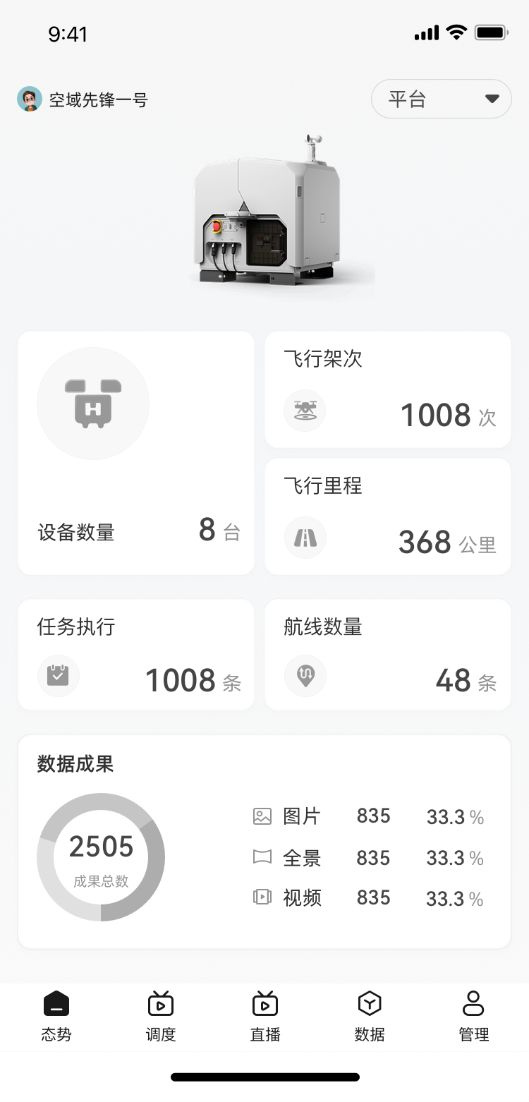智能调度指挥大屏:集成机场分布、限飞区可视化,设备 / 任务 / 媒体数据统计,实景三维设备状态呈现,支持实时巡检监控、远程遥测救援、AI 直播、无人机及负载(云台、喊话器、探照灯)远程控制,指点飞行功能助力精准作业,打造 "一站式" 指挥决策中心。
