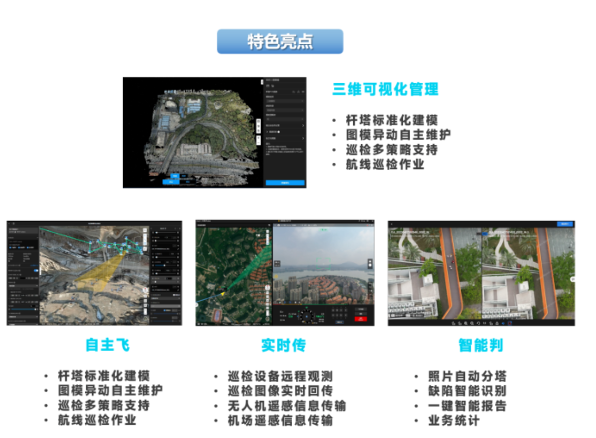 算法自主飞行:基于 AI 算法实现无人机自主飞行控制,结合杆塔标准化建模、图模异动自主维护,提升自主作业能力与巡检精准度。