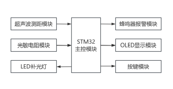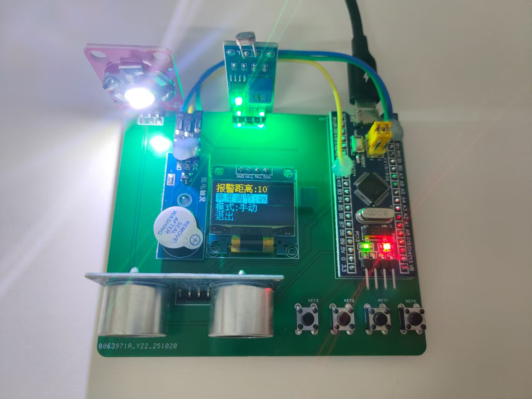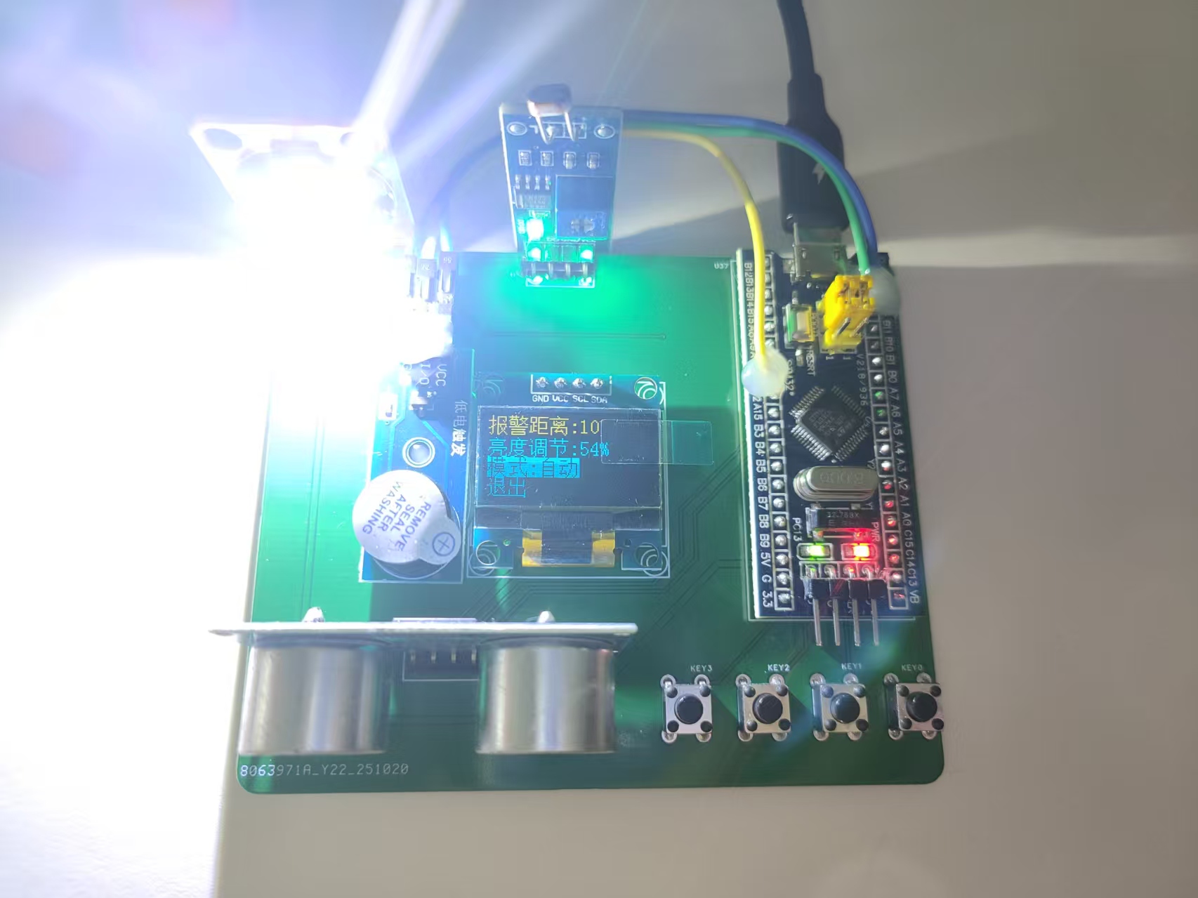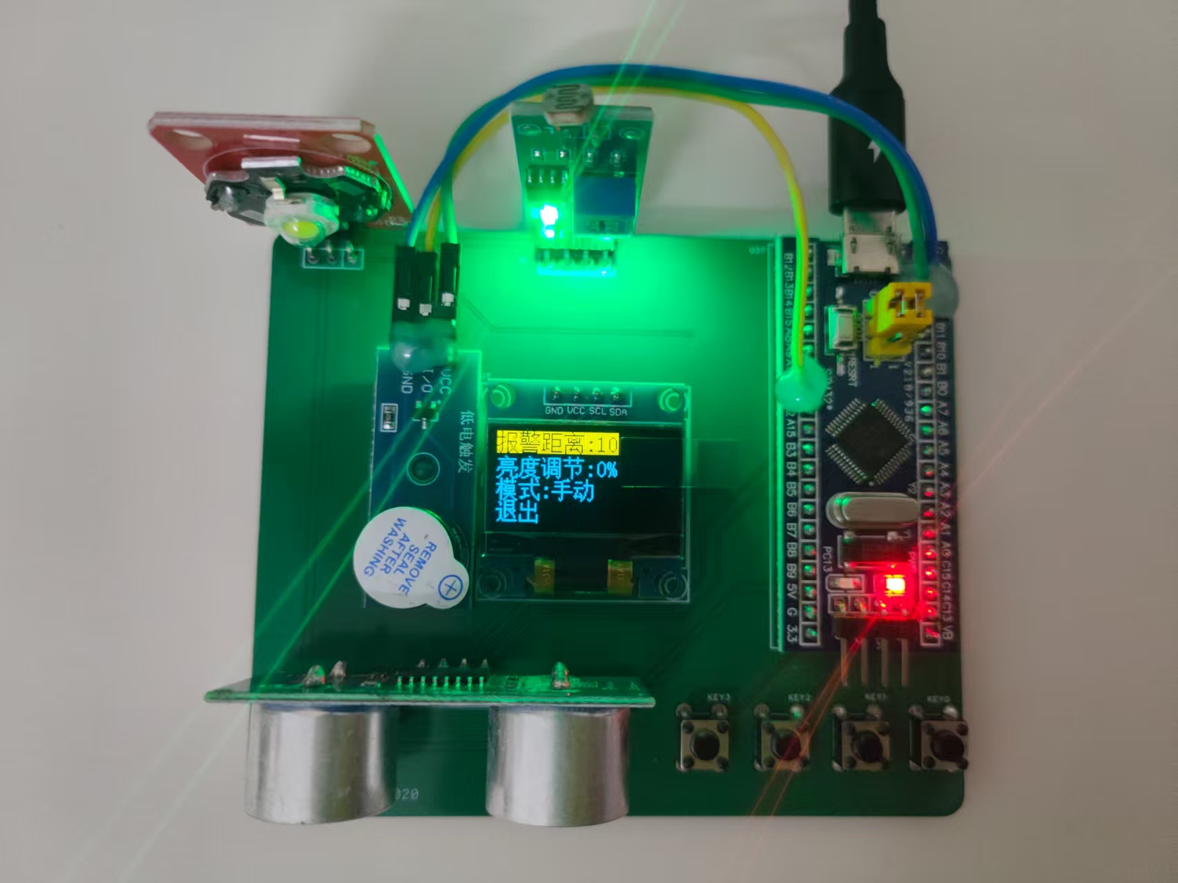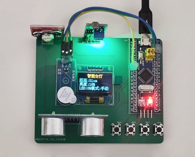 本系统是一款以单片机为核心,集智能调光、坐姿监测与交互显示于一体的多功能智能台灯。它突破了传统台灯的单一照明模式,构建了一个"感知-决策-交互-提醒"的完整智能闭环。系统的核心在于多模式智能亮度控制。用户可在手动模式下通过按键精细调节亮度,满足特定场景需求;也可切换至自动模式,系统通过光敏传感器感知环境光照,并依据预设阈值自动调节LED亮度,实现光线补偿,始终保持桌面光照度的舒适与恒定。所有工作状态,包括当前模式、环境光强、实时亮度等,均清晰显示在OLED屏幕上,交互直观明了。本系统的创新性体现在主动式健康干预功能上。通过集成HC-SR04超声波模块,系统能够实时、非接触地测量用户头部与台灯的距离。用户可预设安全距离阈值,当系统检测到用户坐姿前倾、距离过近时,将立即触发蜂鸣器报警,并可在屏幕上提示警示信息,从而及时纠正不良坐姿,培养良好的用眼习惯。