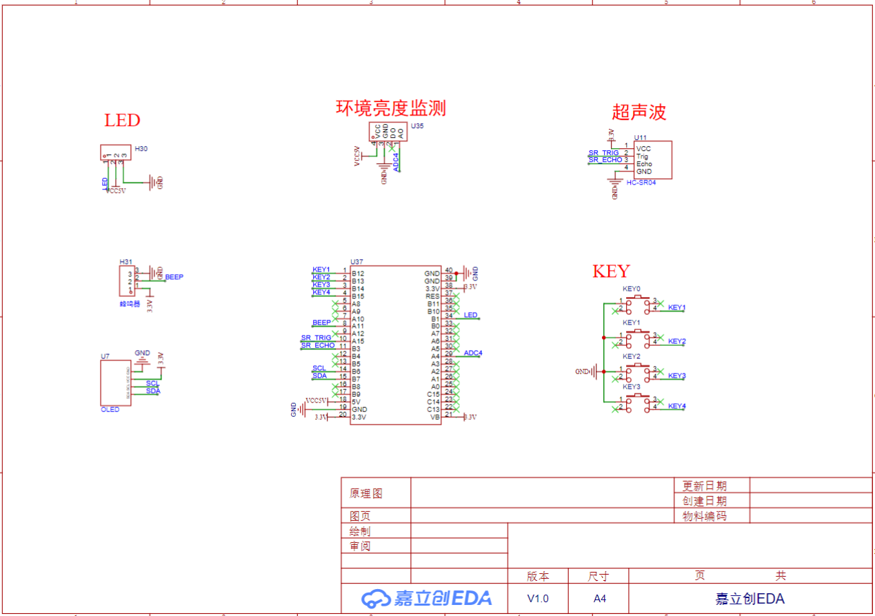 3、HC-SR04超声波测距模块实时监测使用者与台灯的距离。按键可以设定安全距离阈值,低于阈值即触发蜂鸣器报警,提醒纠正人体姿态。