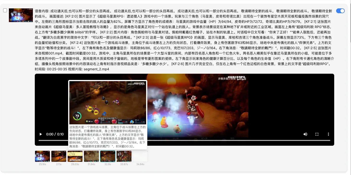 | 双模态理解 | Whisper ASR + VLM 视觉描述 | 视听融合,全面理解视频内容 |