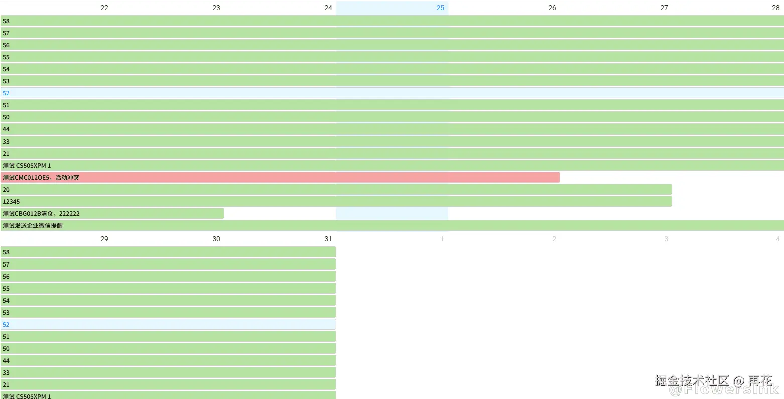 其中比较棘手的需求是日历需要拥有甘特图那样的功能,持续一段时间的活动需要在日历中以长条形态显示,而不同活动的持续时间不同、排序顺序也不同,互相拼凑留空的逻辑非常复杂。