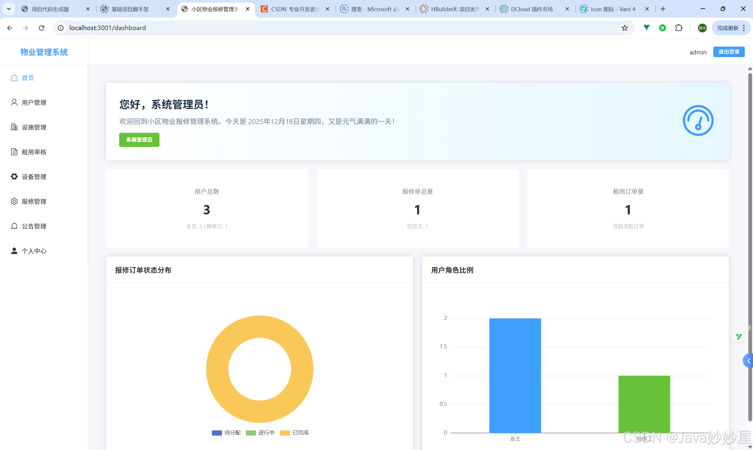 首页仪表盘:数据统计图表(用户数、报修单统计、租用订单等)
