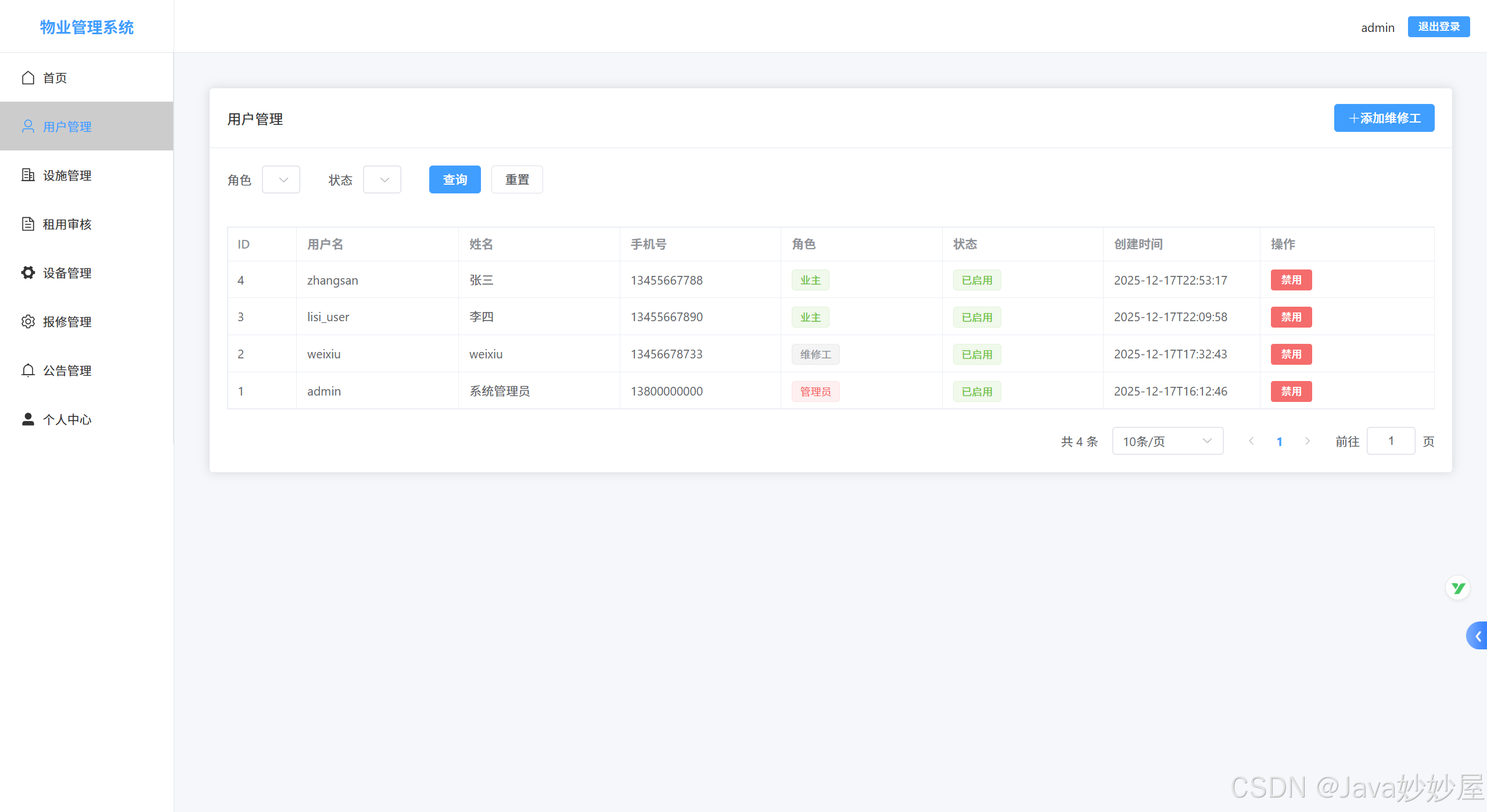 系统用户管理:审核业主注册、创建维修工、启用/禁用用户