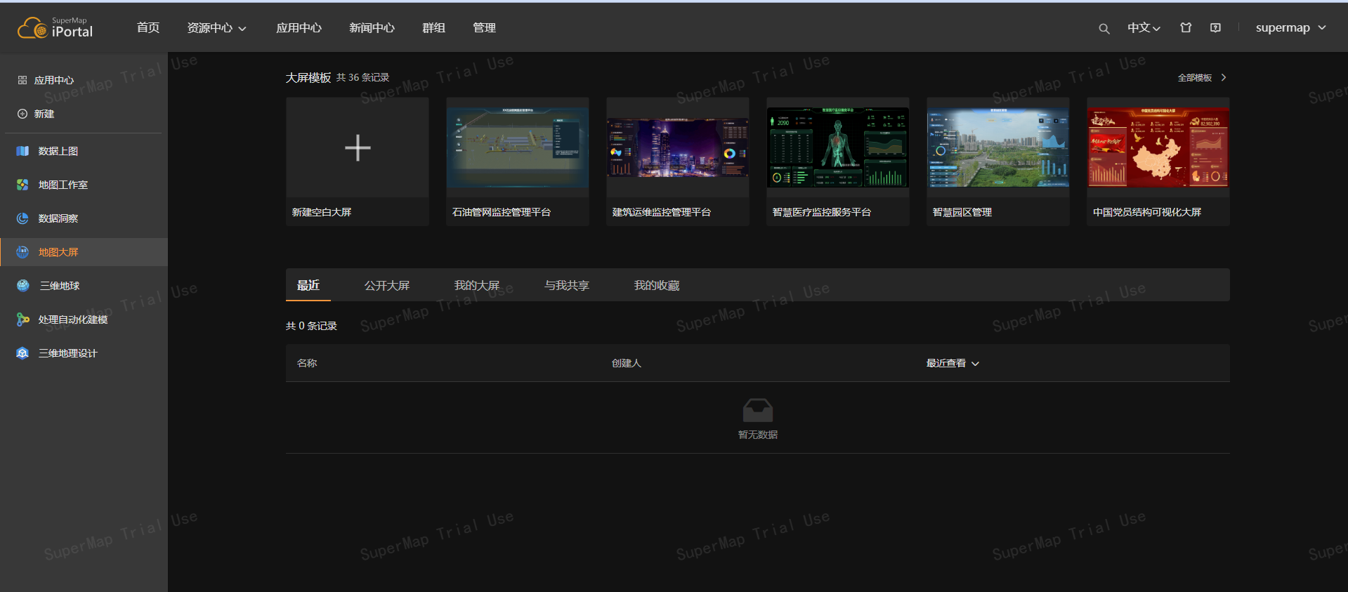SuperMap iPortal 提供了丰富的地图大屏模板,但实际应用中这些预设模板可能不完全符合业务需求,那要如何去删除不需要的模版呢?下面以删除第一个模板"四川省发电量及发电结构统计"为例进行介绍。