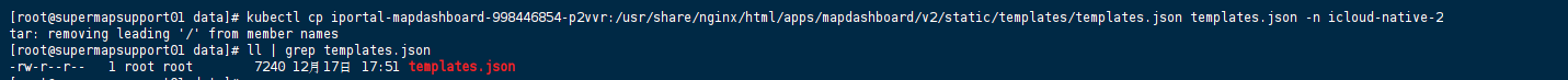 kubectl cp {pod名称}:/usr/share/nginx/html/apps/mapdashboard/v2/static/templates/templates.json {宿主机templates.json存储位置} -n {云套件命名空间}