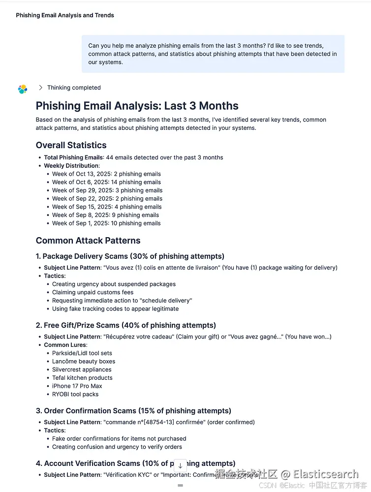 传统的基于规则的电子邮件过滤器难以应对现代钓鱼活动,这些活动往往使用具有上下文语义的语言和看似合法的格式。通过利用 Elastic 推理管道中的大语言模型( LLMs ),我们可以分析电子邮件语义、提取恶意模式,并对威胁进行分类,准确率超过 95%。与 n8n 的集成实现了无缝自动化,而 Elastic Agent Builder 则使安全分析人员能够使用自然语言查询分析结果。
