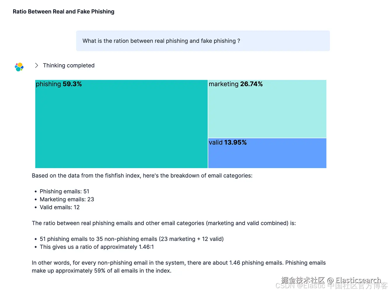 Agent Builder 查询 "What is the ration between real phishing and fake phishing?" 显示了整体邮件组成: