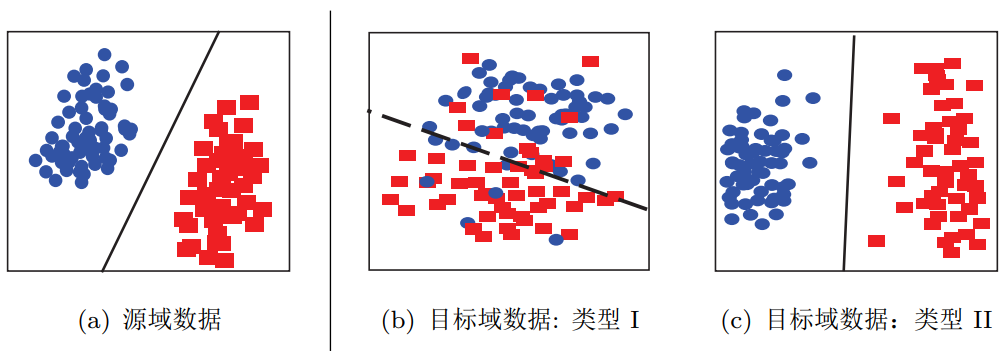 数据分布自适应 (Distribution Adaptation) 是一类最常用的迁移学习方法。这种方法的基本思想是,由于源域和目标域的数据概率分布不同,那么最直接的方式就是通过一些变换,将不同的数据分布的距离拉近。 下图形象地表示了几种数据分布的情况。简单来说,数据的边缘分布不同,就是数据整体不相似。数据的条件分布不同,就是数据整体相似,但是具体到每个类里,都不太相似。