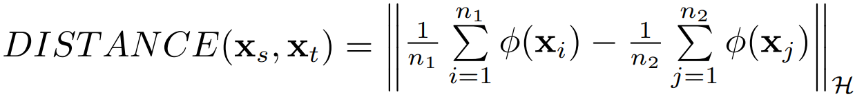 更进一步,这个距离怎么算?机器学习中有很多种形式的距离,从欧氏距离到马氏距离,从曼哈顿距离到余弦相似度,我们需要什么距离呢?TCA 利用了一个经典的也算是比较"高端"的距离叫做最大均值差异 (MMD,maximum mean discrepancy)。我们令 n1, n2 分别表示源域和目标域的样本个数,那么它们之间的 MMD 距离可以计算为: