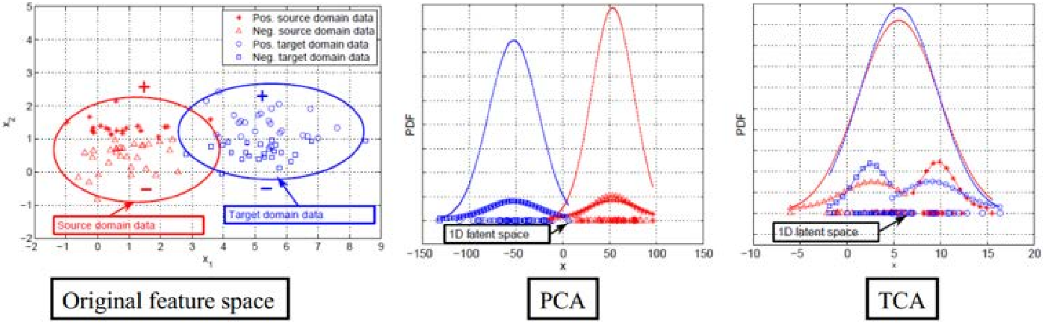 为了形象地展示 TCA 方法的优势,我们借用 [Pan et al., 2011] 中提供的可视化效果, 在图中展示了对于源域和目标域数据 (红色和蓝色),分别由 PCA(主成分分析) 和 TCA 得到的分布结果。从图 20中可以很明显地看出,对于概率分布不同的两部分数据,在经过 TCA 处理后,概率分布更加接近。这说明了 TCA 在拉近数据分布距离上的优势。