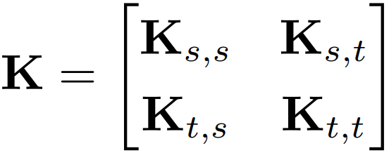 仍然没法求。 TCA 是怎么做的呢,这里就要感谢矩阵了!我们发现,上面这个 MMD 距离平方展开后,有二次项乘积的部分!那么,联系在 SVM 中学过的核函数,把一个难求的映射以核函数的形式来求,不就可以了?于是,TCA 引入了一个核矩阵 :