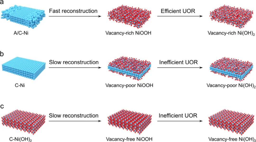 该示意图系统对比了不同催化剂的反应路径,清晰揭示了本工作的核心逻辑:非晶/晶相异质结结构 → 加速电化学重构 → 形成高浓度活性空位 → 高效催化尿素脱氢。这张图将复杂的机制以简洁直观的方式呈现,阐明了性能提升的根源。