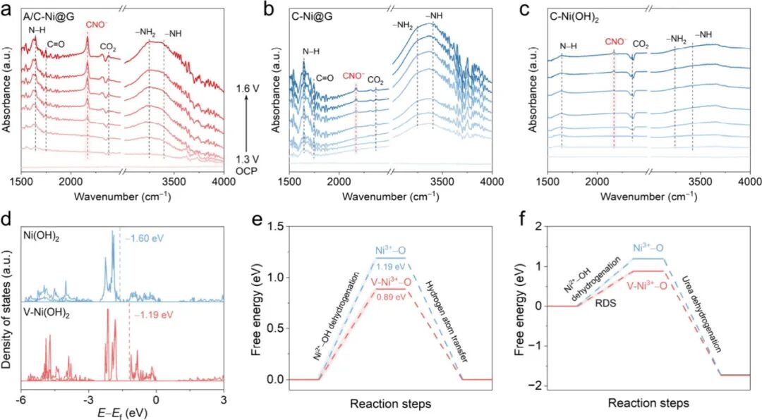 通过原位XRD和EXAFS监测,研究发现A/C-Ni@G在施加电位后能快速、彻底地重构为无定形氢氧化镍物种 ,且该物种富含配位空位。与之对比,晶态对照样品的重构则缓慢且不完全。原位红外光谱在异质结催化剂表面检测到更强的中间体CNO⁻信号 ,证明其C-N键断裂能力更强。DFT理论计算从电子结构层面给出解释:重构形成的富空位活性位点d带中心更靠近费米能级,不仅降低了自身形成的能垒,也优化了对反应中间体的吸附,从而全面加速了反应。