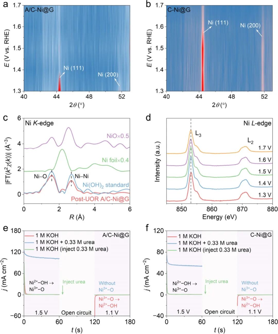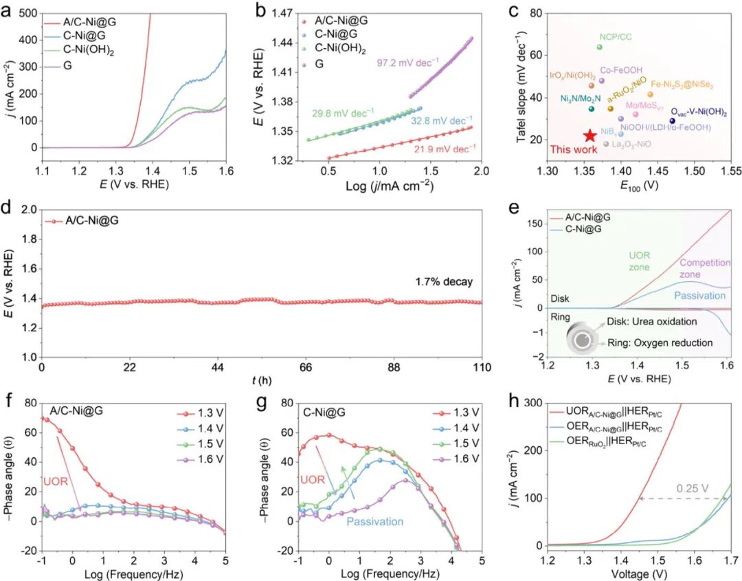 电化学测试数据全面展示了性能优势。线性扫描曲线显示,A/C-Ni@G达到100 mA cm⁻²的电位比晶态对照样品低约60 mV。其21.9 mV dec⁻¹的Tafel斜率 和0.7 Ω的极低电荷转移电阻 ,共同证实了其优异的反应动力学与电子传输能力。旋转环盘测试表明在宽电位窗口内对尿素氧化具有接近100%的选择性。实际组装的两电极尿素电解系统,在相同电流下电压比水电解系统低0.25 V,节能效果显著。