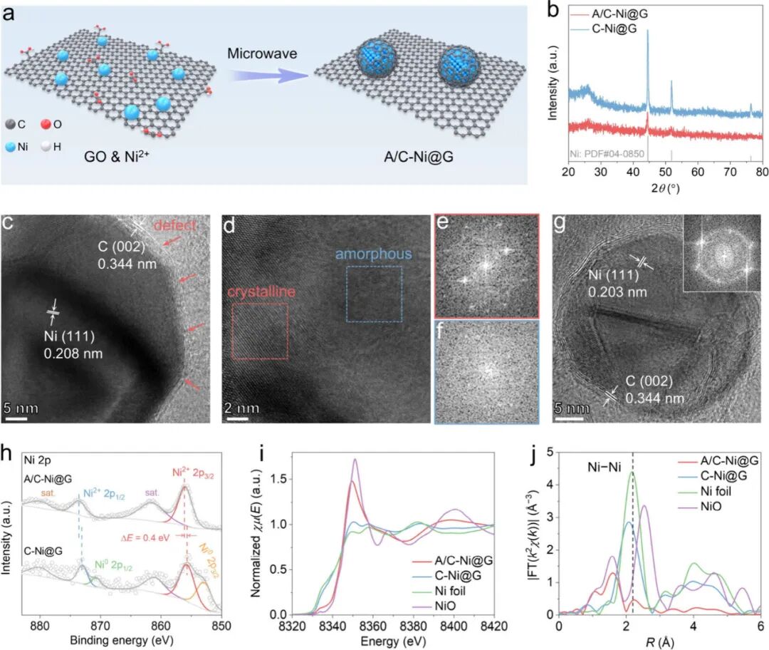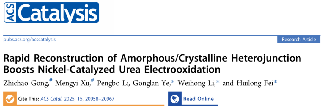 将含尿素废水处理与清洁制氢相结合,是极具前景的绿色能源技术,但其核心催化剂面临活性与稳定性难以兼得的挑战。近日,湖南大学费慧龙教授、叶龚兰助理教授及香港城市大学李威宏教授团队在催化领域顶级期刊《ACS Catalysis》 上发表重要研究成果。该团队通过 >1000°C的瞬时微波热冲击 技术,成功制备出石墨烯包覆的非晶/晶相异质结镍催化剂 。该独特结构能加速电化学重构 ,在尿素氧化反应中仅需1.358 V的低电位 即可驱动100 mA cm⁻²的高电流,性能显著超越多数已报道催化剂,为高效尿素能源转化系统提供了关键材料解决方案。