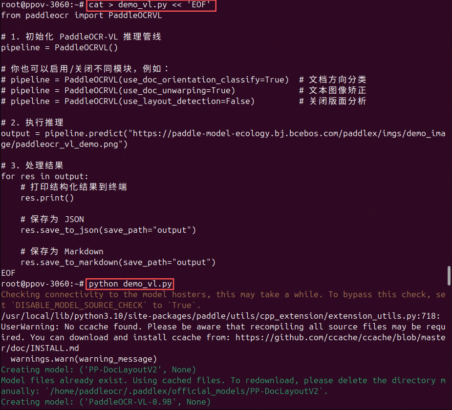 PaddleOCR-VL 提供了开箱即用的 Python 推理接口 PaddleOCRVL。在官方 Docker 镜像中,相关依赖与模型已预先安装,用户只需初始化推理管线并调用 predict() 方法即可完成文档理解任务。推理结果可直接导出为结构化 JSON 或 Markdown,方便下游系统集成。