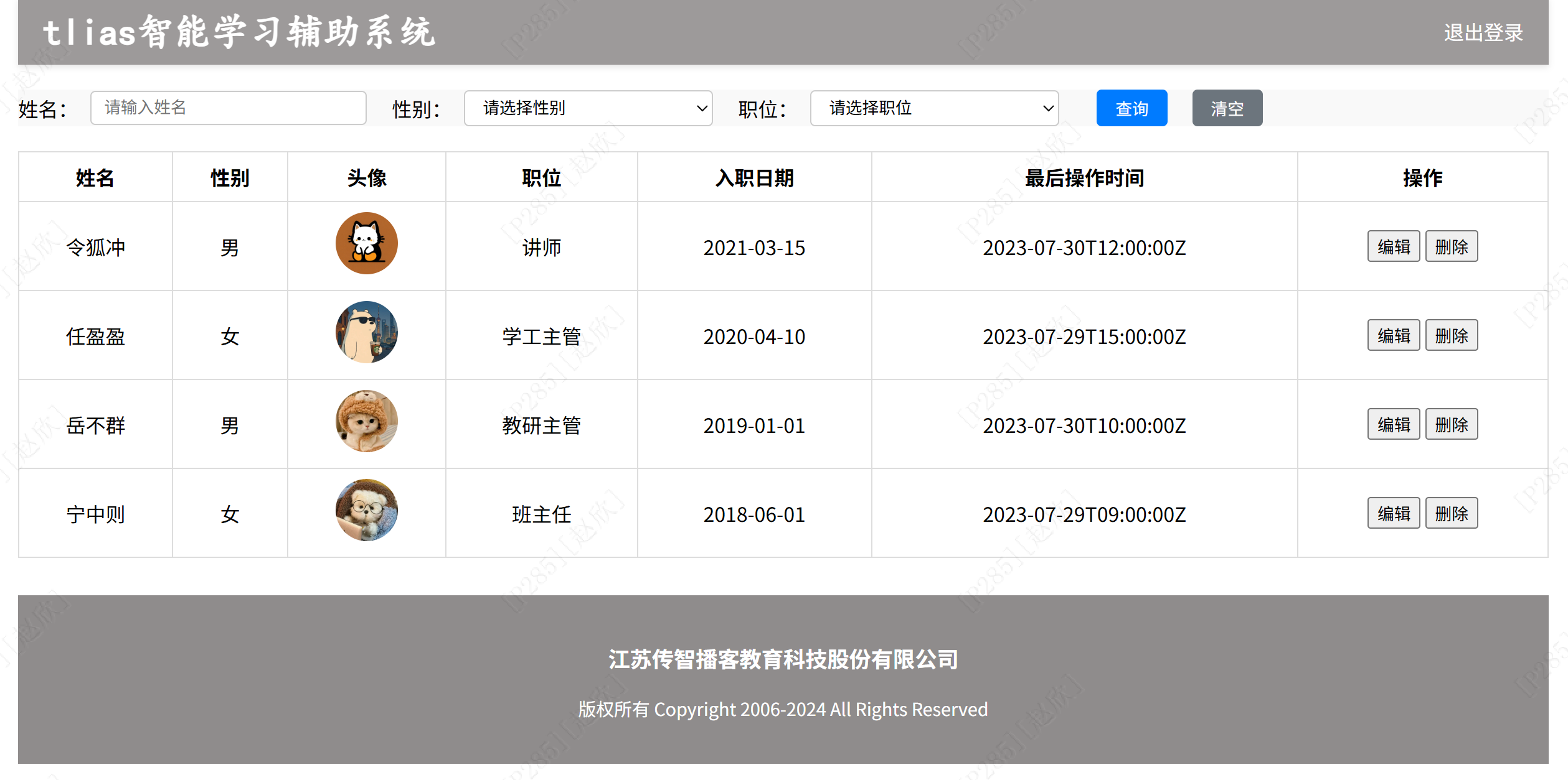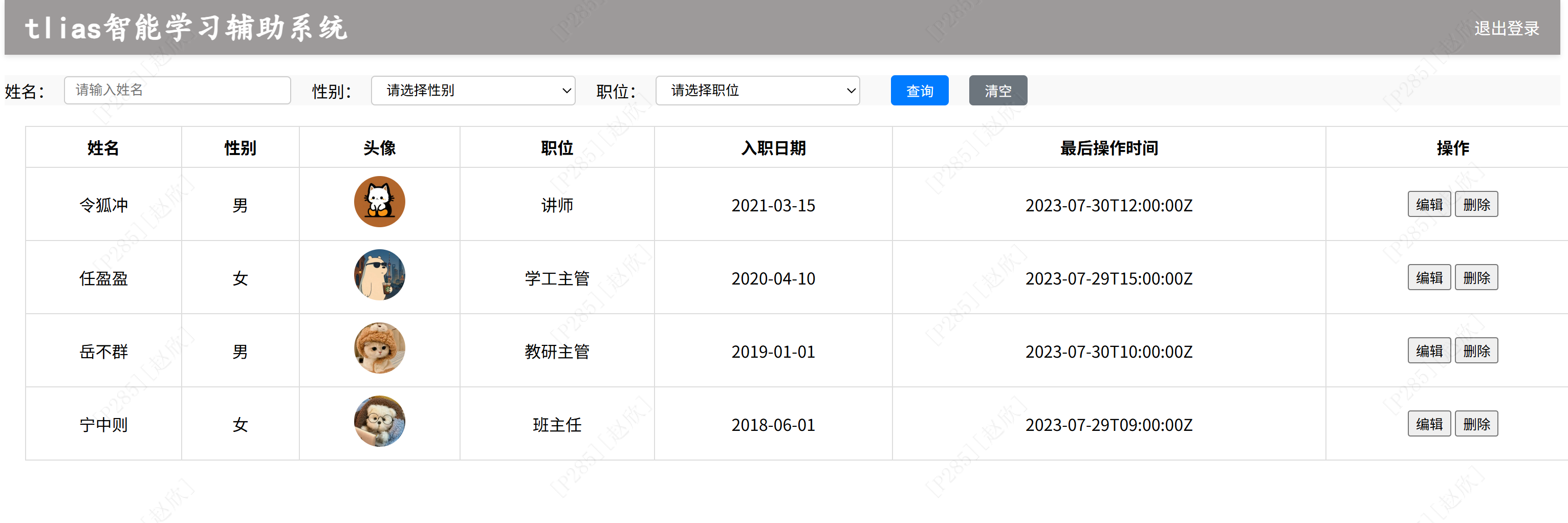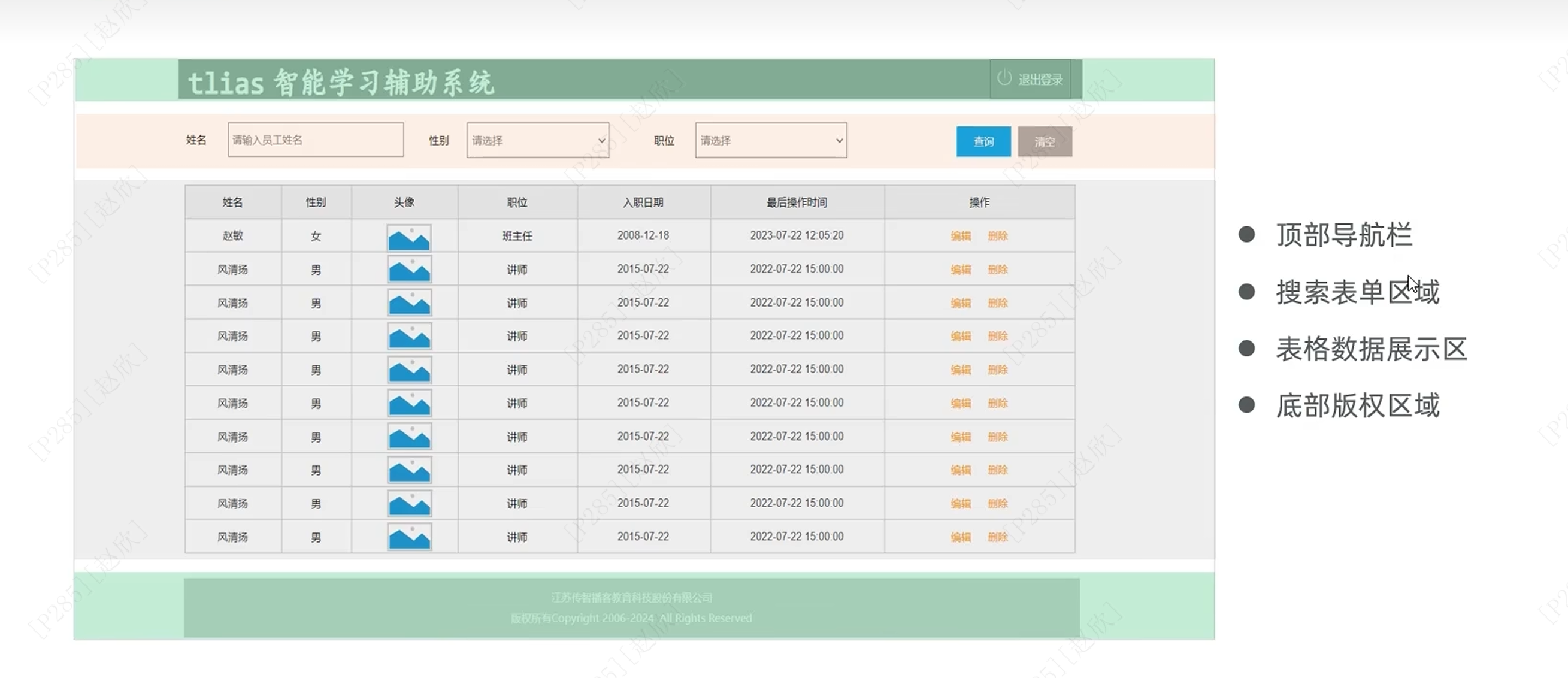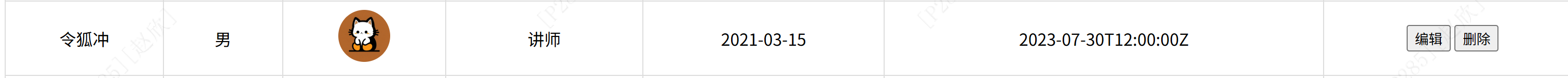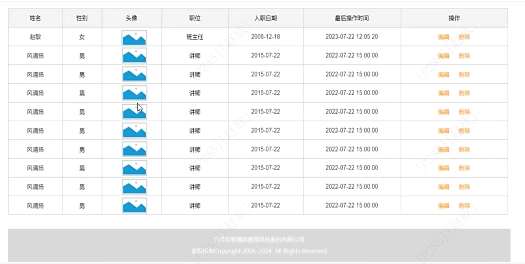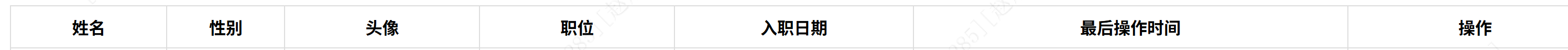 首先声明table,表明是表格,之后先将表头放在thead中,之后<tr>表示行,一对tr表示一行,如上述的姓名、性别、头像、职位、入职日期、最后操作时间和操作,其中一个<th>就分别表示上述具体的内容,定义表头单元格,如姓名等,如下所示: