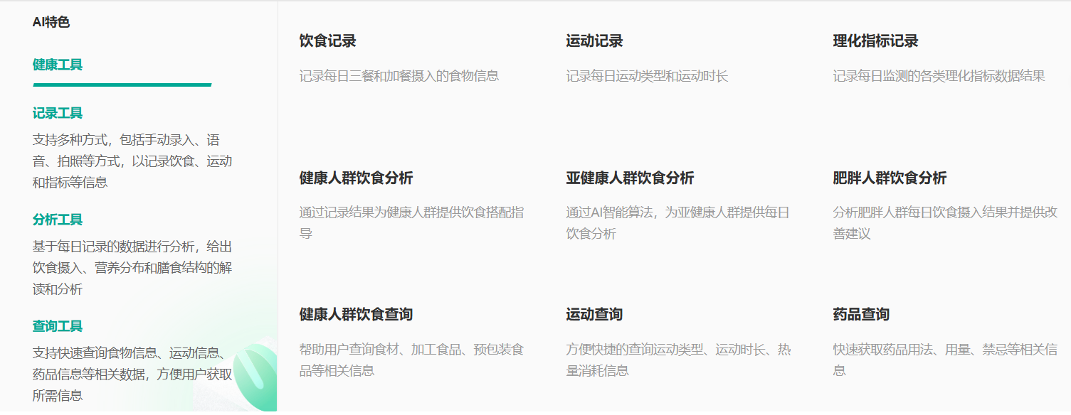 一是"技术+专业"双驱动:融合机器视觉、NLP等AI技术与医学、营养学知识,确保服务科学精准,如食物图像识别可快速分析营养成分;