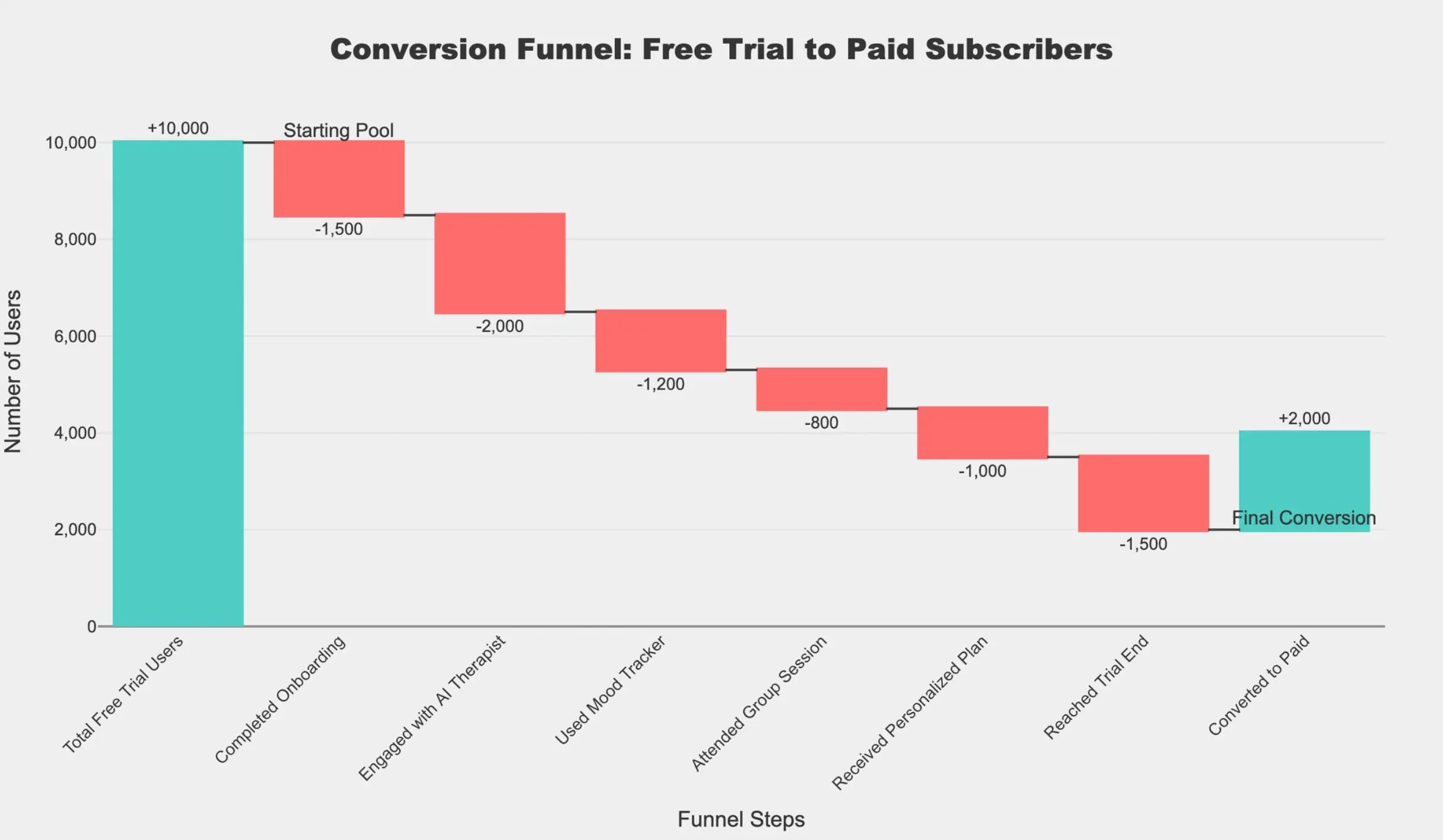 为了确定免费试用用户的总数,我需要查看漏斗图中标有"Total Free Trial Users"(总免费试用用户数)的第一个柱状条。该柱状条代表了开始免费试用的初始用户群体。
