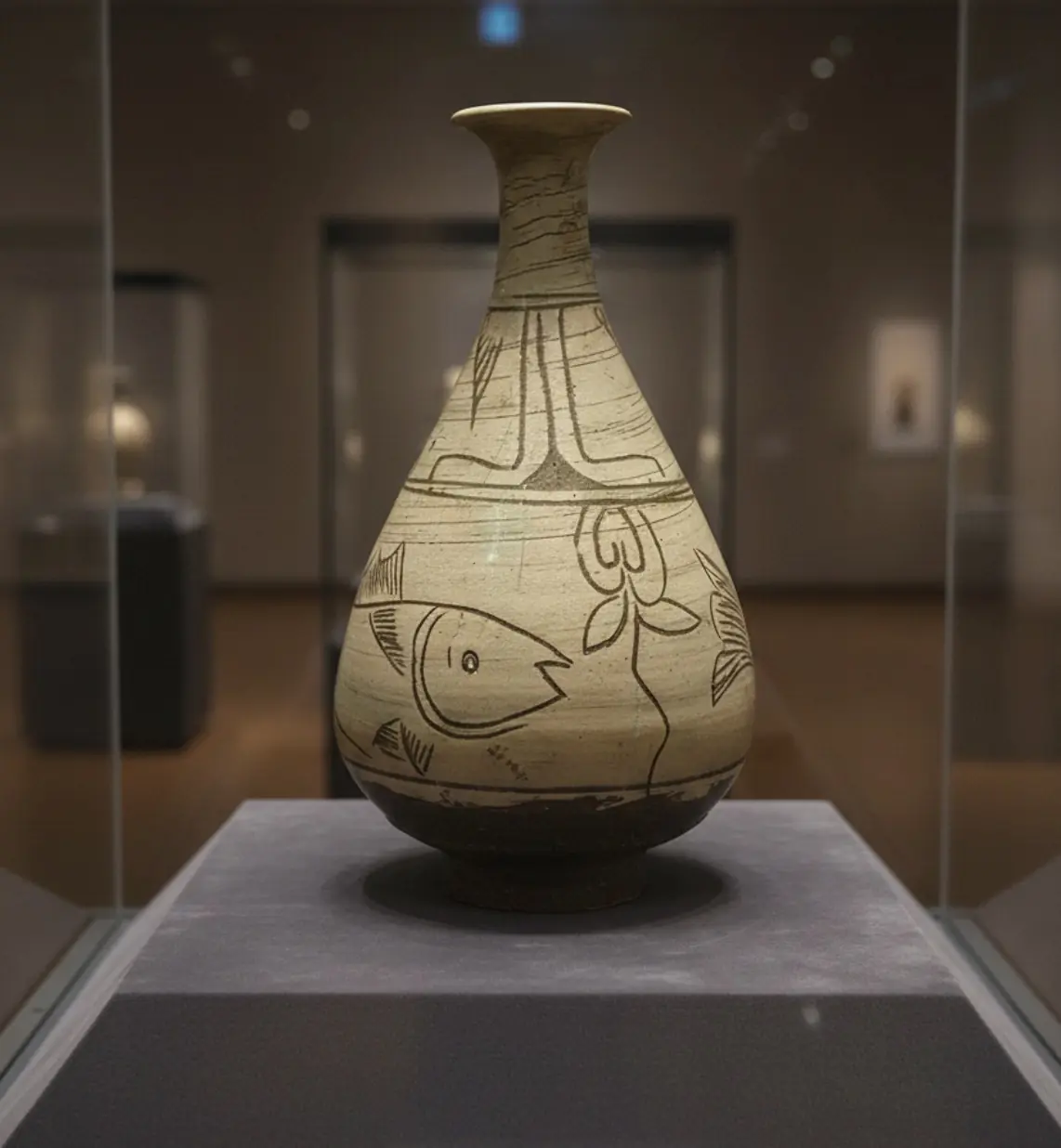 这件陶器很可能源自朝鲜高丽王朝晚期(918--1392年),该时期以精致的陶瓷艺术著称。器物细颈鼓腹的造型,辅以风格化的鱼纹与花卉图案,表明其用途偏向礼仪性或装饰性。其砂质肌理与灰蓝色釉面,反映出当时朝鲜陶工采用含铁陶土及传统还原焰烧制工艺的典型技法。鱼纹可能象征富足或与自然的和谐,体现了当时的主流文化价值观。此器被博物馆珍藏并展出,彰显了它作为朝鲜陶瓷艺术瑰宝的重要历史与文化意义。