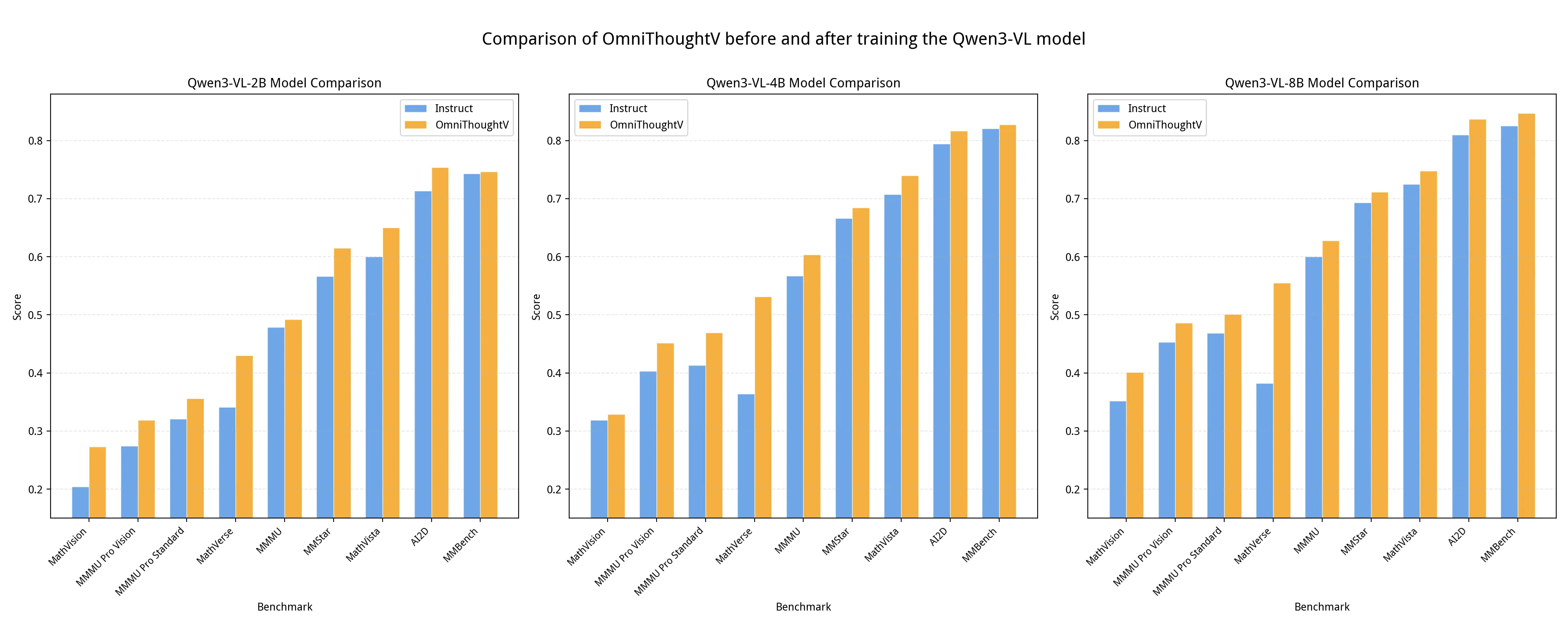 本文介绍了OmniThoughtV数据集,这是首个开源的大规模多模态长思考蒸馏数据集。我们完整构建了一套透明、可复现、高质量的多模态数据蒸馏与筛选流程,并系统验证了其在提升多模态大模型视觉推理能力方面的关键作用。我们通过严谨的消融实验,首次明确指出"难度"指标在数据筛选中的核心价值:相较于单纯依赖标注质量评分,引入高难度样本能更有效地驱动模型学习复杂推理逻辑,从而显著提升泛化性能。基于这一发现,我们设计了完整的数据过滤标准,从原始数据集中精准提炼出约50万条兼具挑战性与代表性的训练样本,并成功提升了Qwen3-VL系列的性能表现。实验结果表明,该数据流程不仅使各模型在多个权威评测集上实现稳定且显著的能力跃升,更展现出良好的模型规模扩展性。本工作填补了当前开源社区在结构化、可复现、面向推理能力提升的多模态数据蒸馏上的空白;在未来,我们会继续深入探索大模型的蒸馏和训练技术,推动大模型在各个场景的落地。