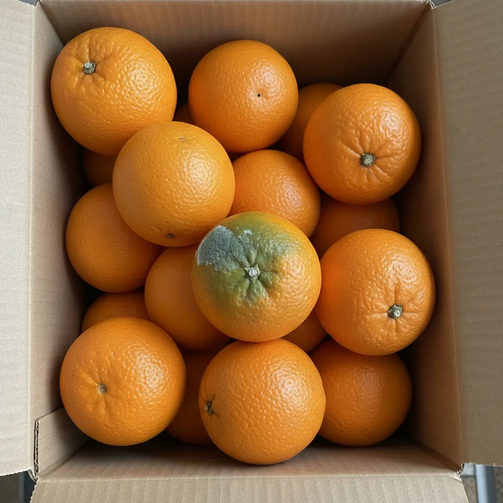 图片显示了一盒橙子,其中一个橙子表面明显长有霉菌(灰绿色斑块)。水果上出现霉菌是变质的明确标志,通常被视为缺陷,会使该产品不符合新鲜且安全食用的标准。