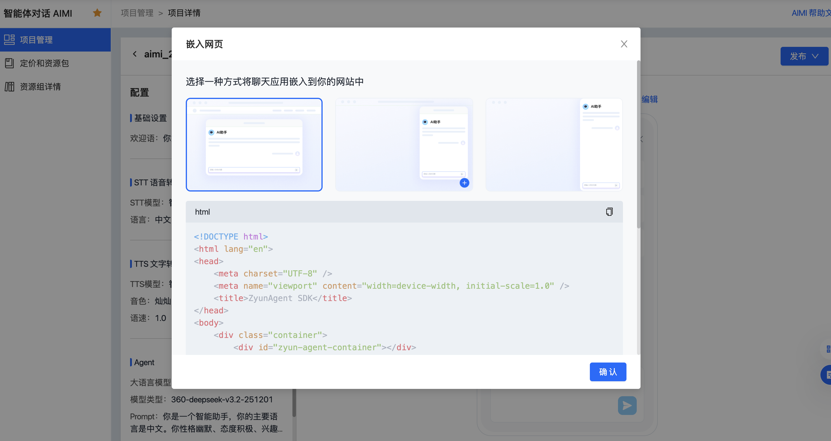 - 点击嵌入网站按钮,选择物业需要场景,可复制前端嵌入SDK