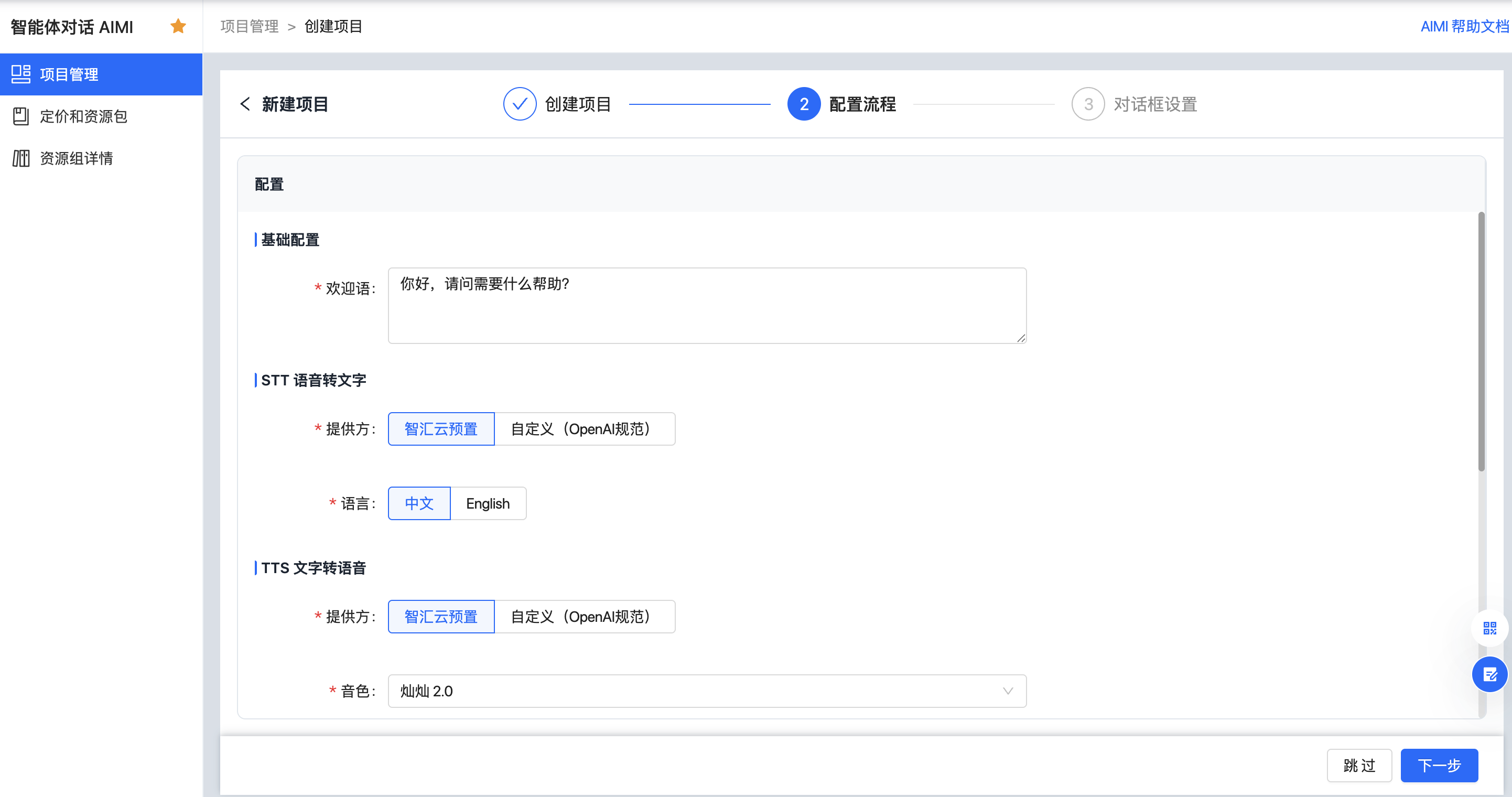 根据场景选择配置流程,欢迎语、STT、TTS 及 Agent