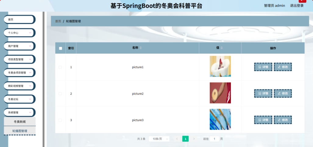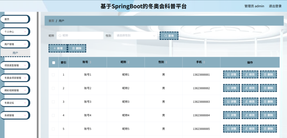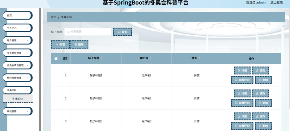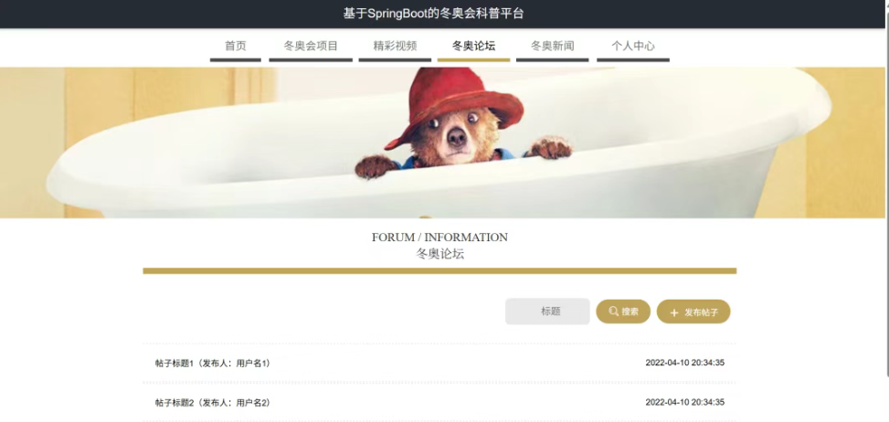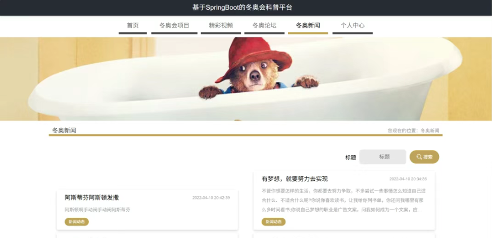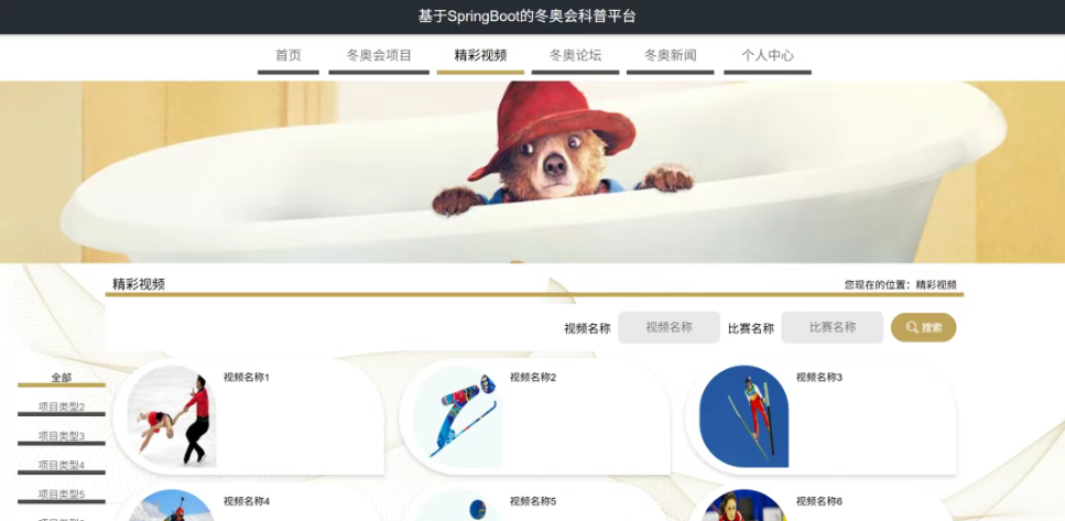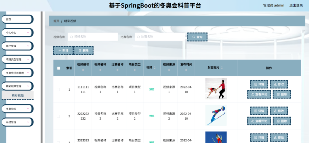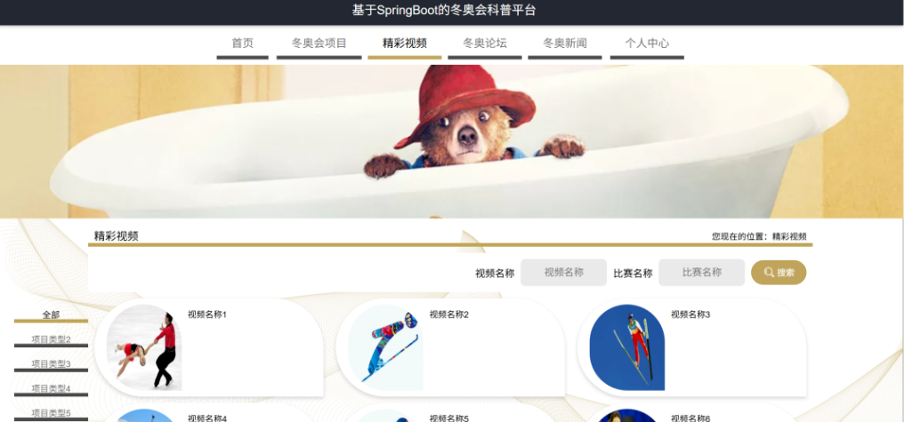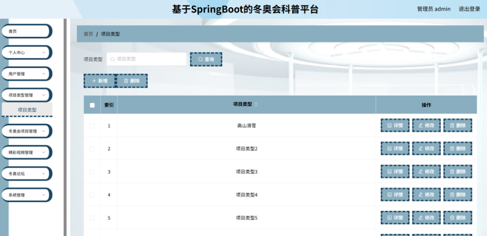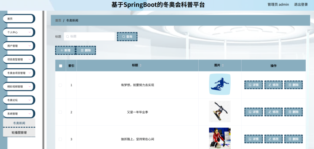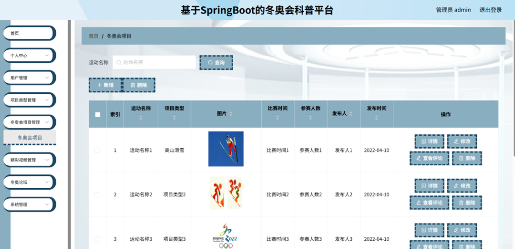 基于SpringBoot+Vue实现的冬奥会科普平台采用前后端分离架构方式,系统设计了管理员、用户两种角色,系统实现了用户登录与注册、个人中心、用户管理、项目类型管理、冬奥会项目管理、精彩视频管理、冬奥论坛、冬奥新闻、轮播图管理等功能。