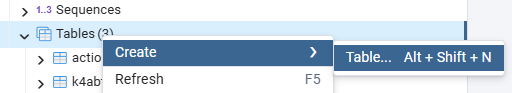在 数据库→Schemes→public→Tables 路径下右键 Tables,选择 Create→Table... 。