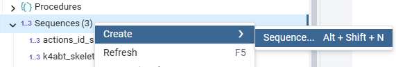 创建 Sequence 流程也类似,找到 数据库→Schemes→public→Sequences 路径下右键 Sequences,选择 Create→Sequence... 。